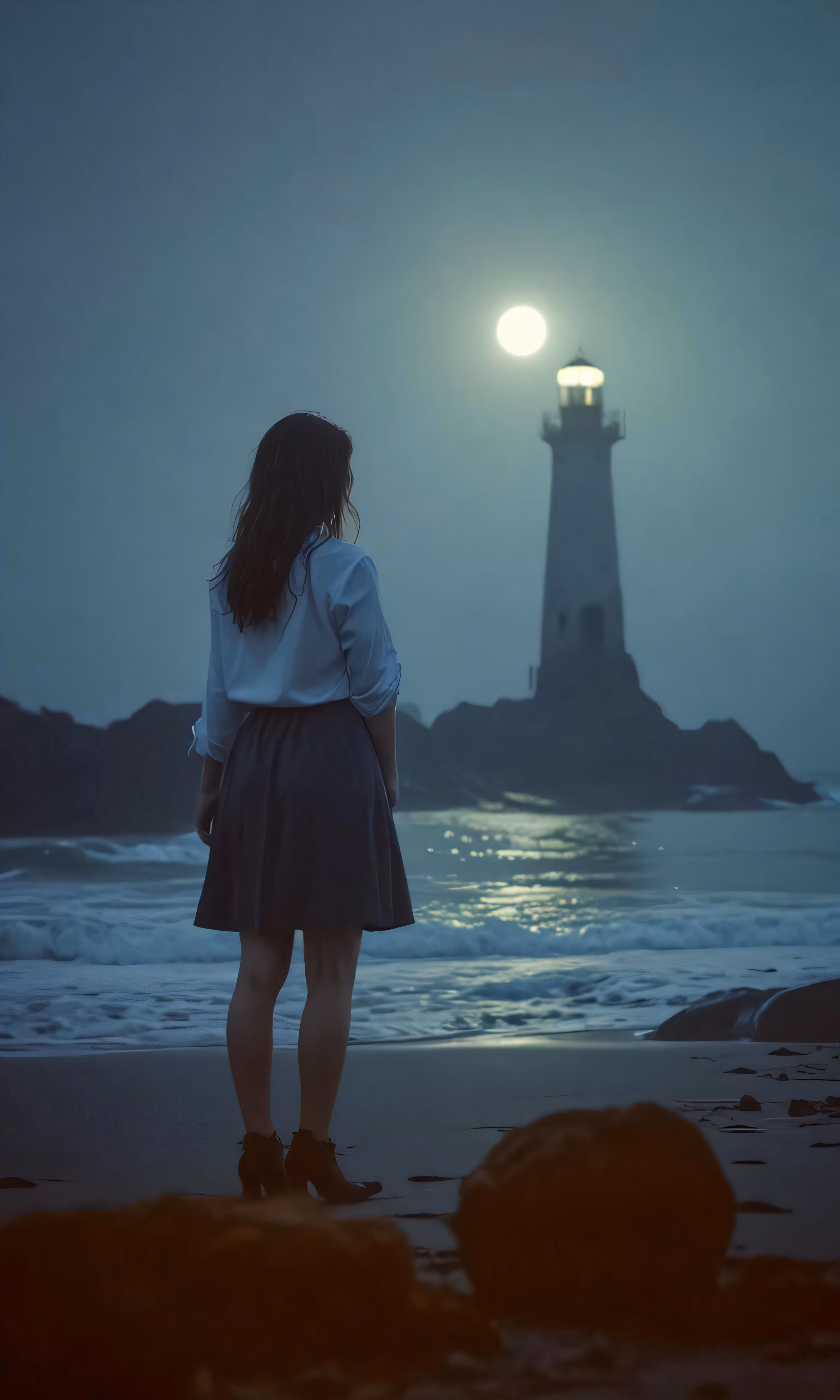 High resolution picture, free to use, a woman looking out to the ocean as the moon sets