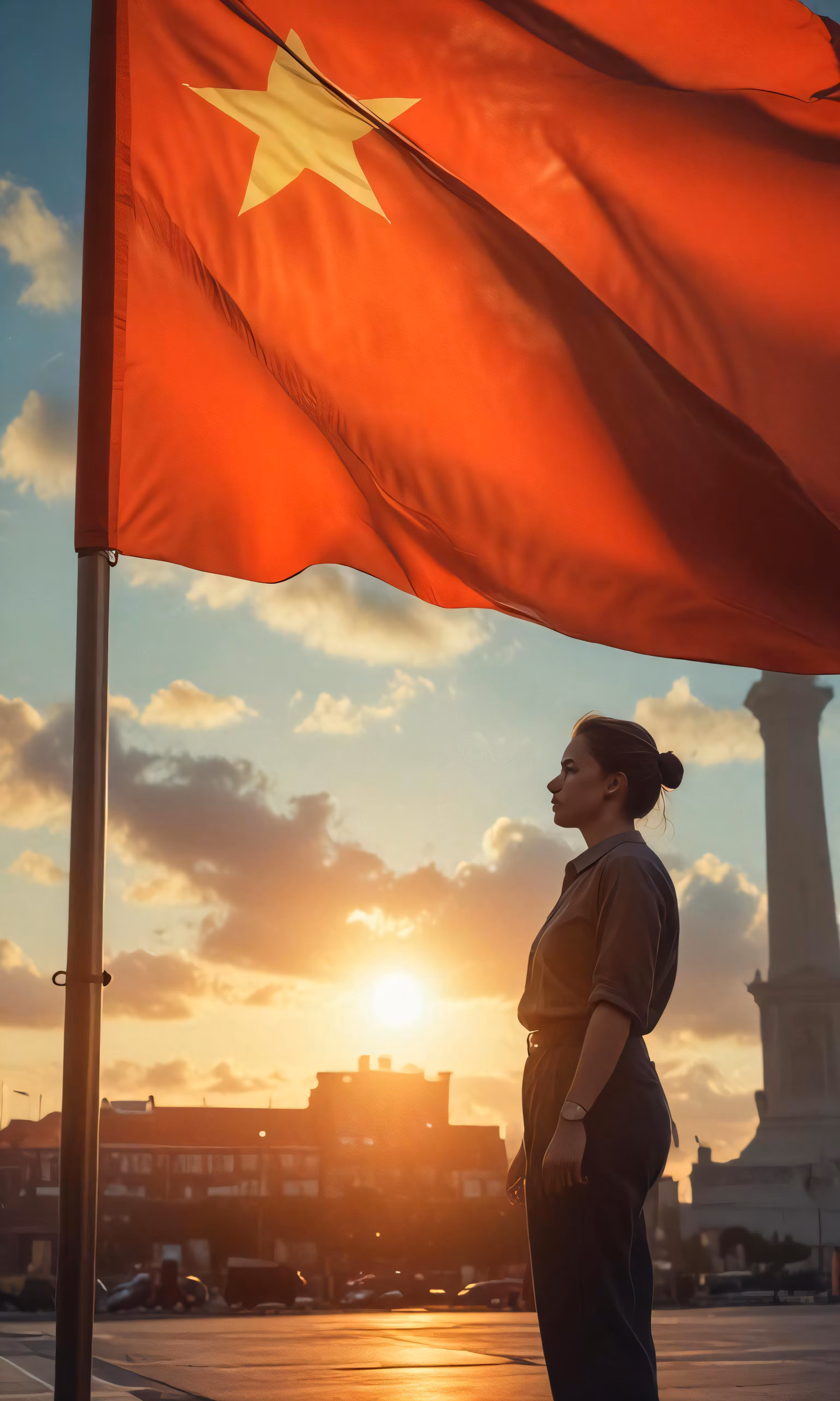 High resolution picture, free to use, a woman looking up at the sky, next to a flag