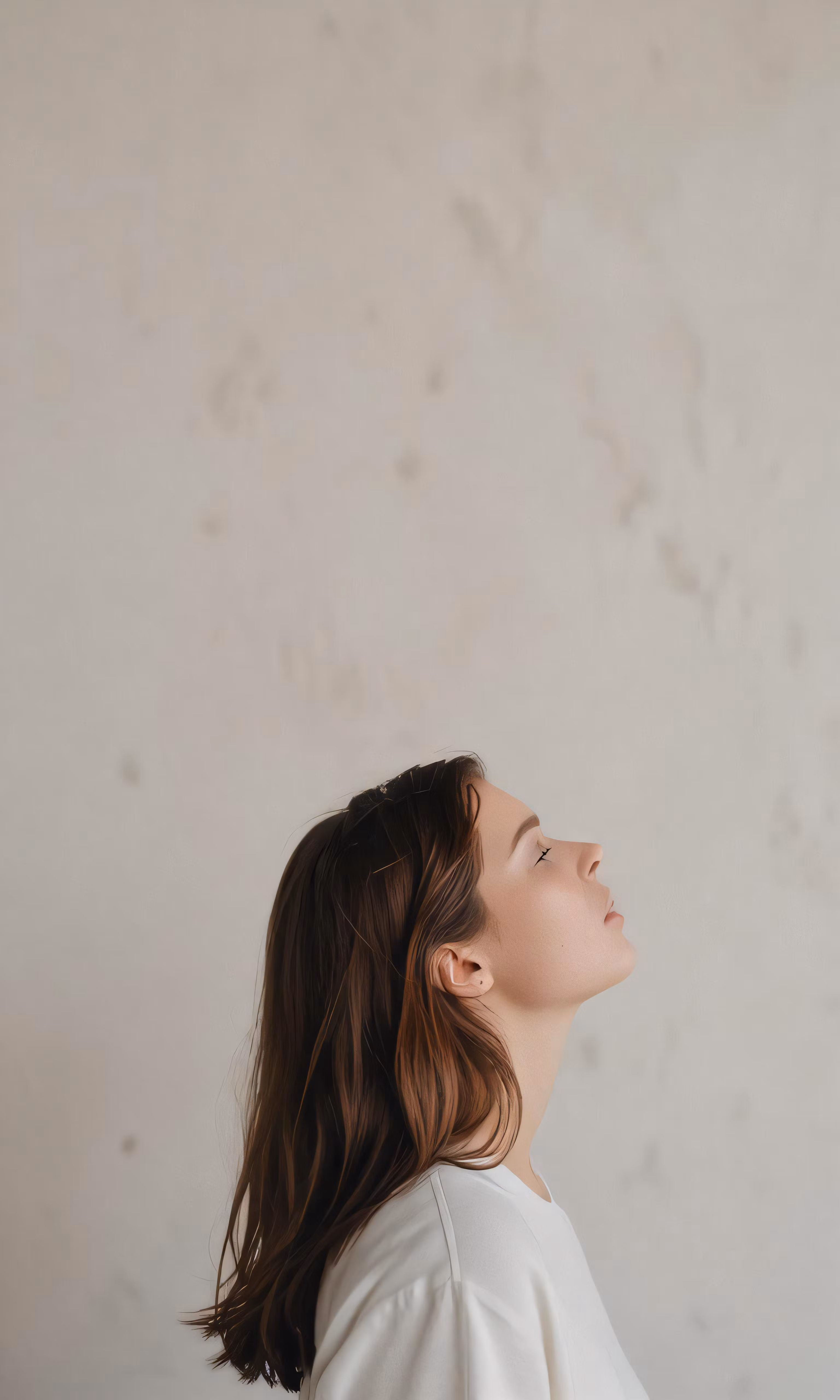 High resolution picture, free to use, a woman looking up while standing on a white surface