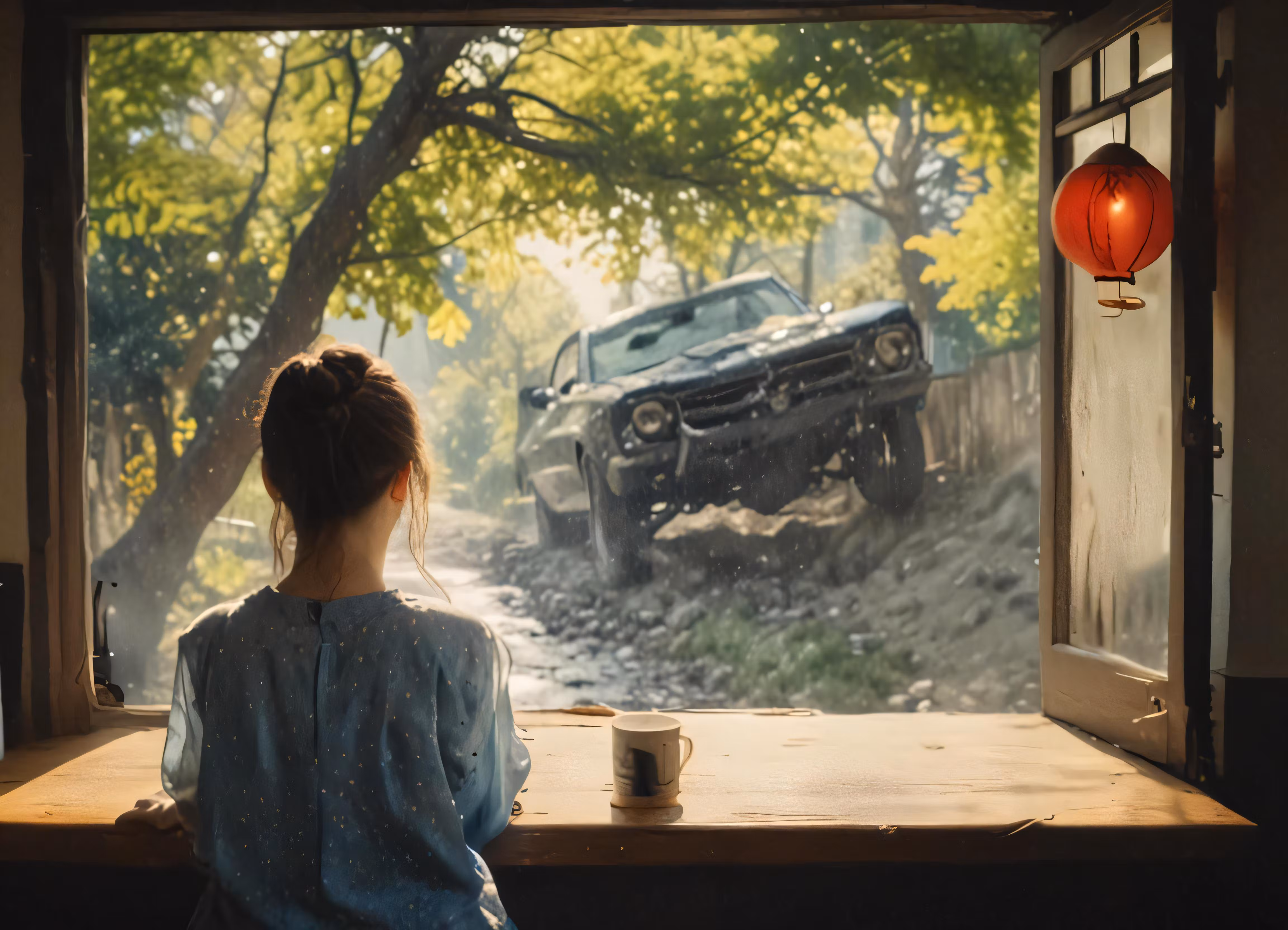 High resolution picture, free to use, a woman looks out an open window to the countryside