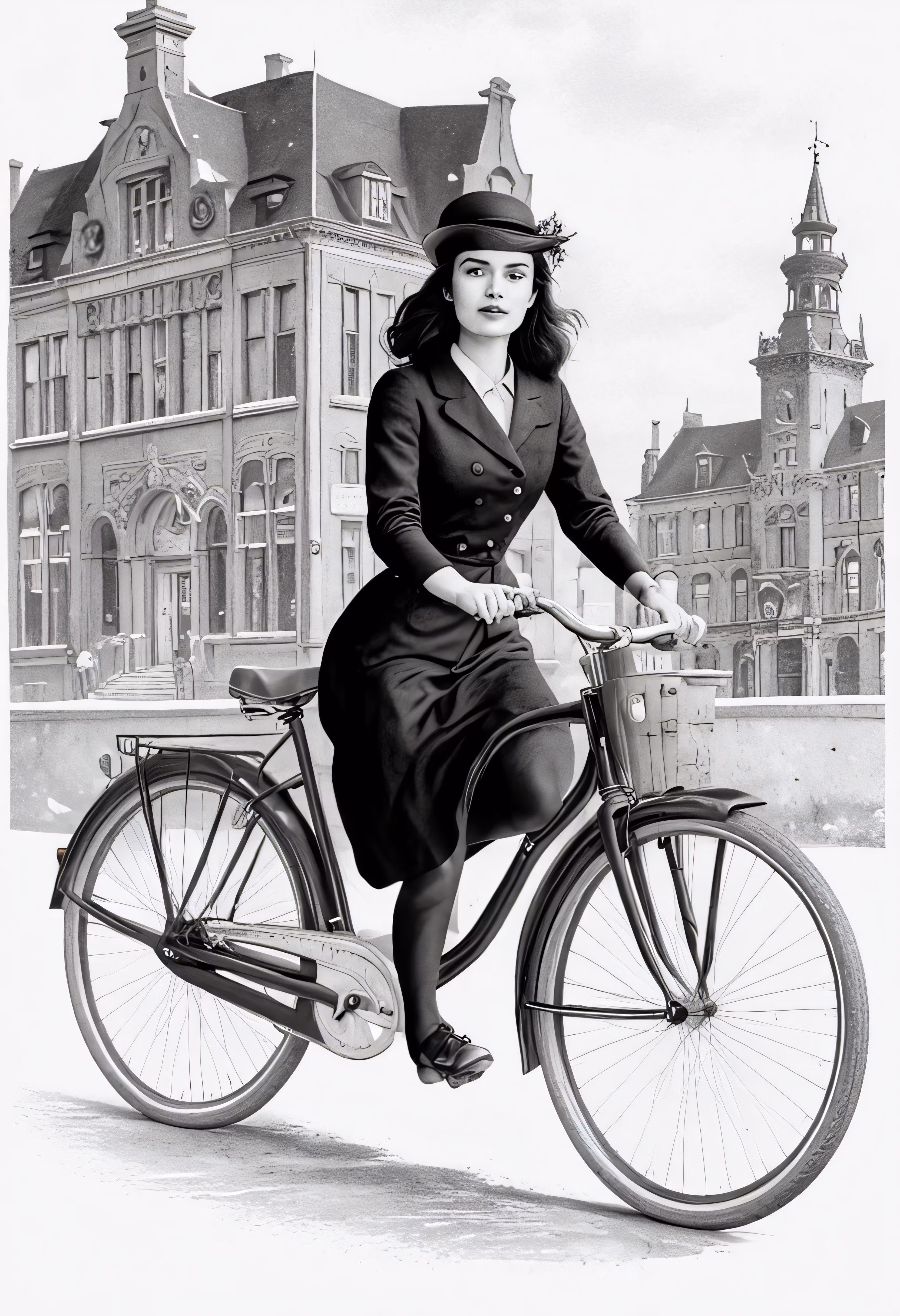 High resolution picture, free to use, a woman on a bike is in front of an old building