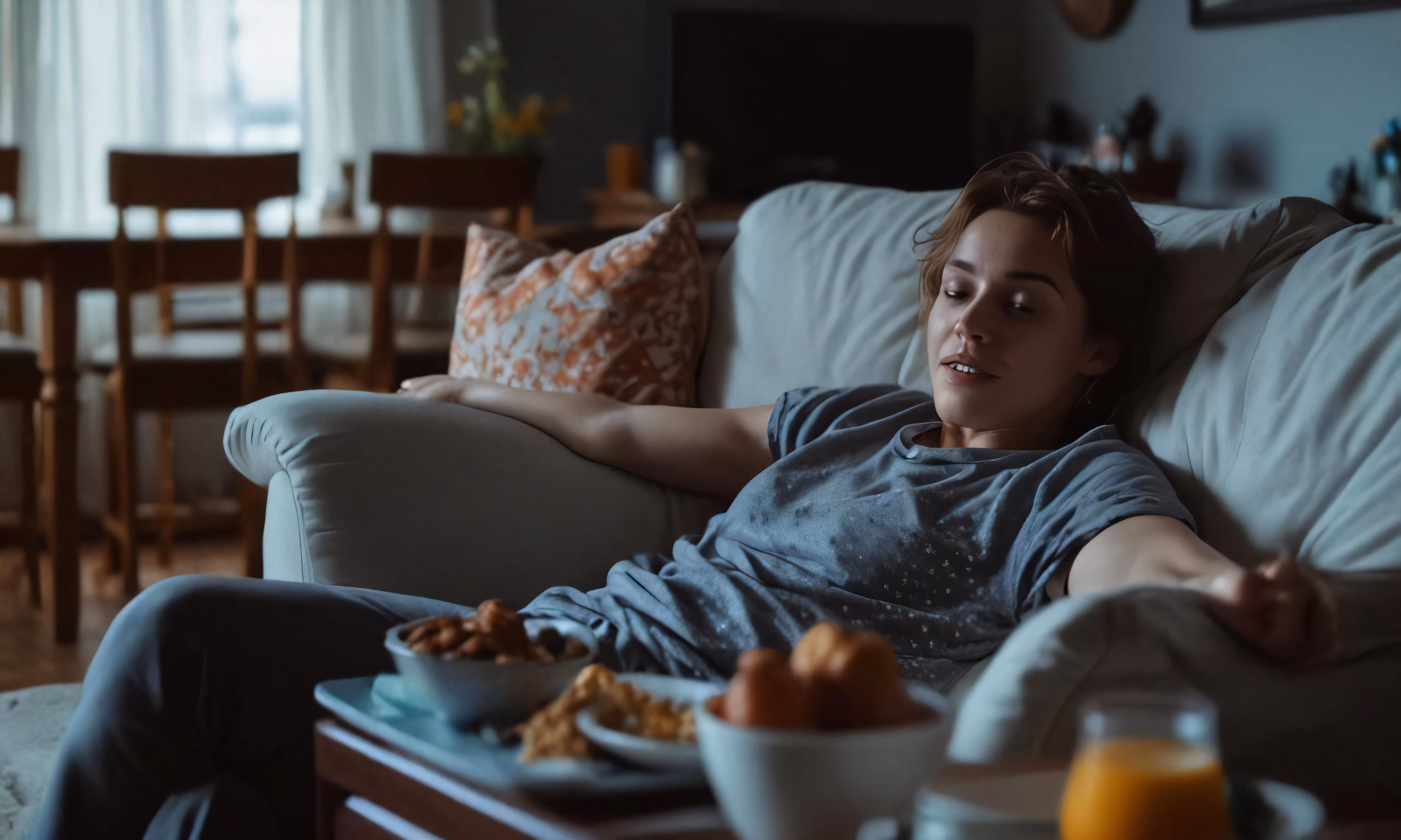 High resolution picture, free to use, a woman on a couch with food and drinks