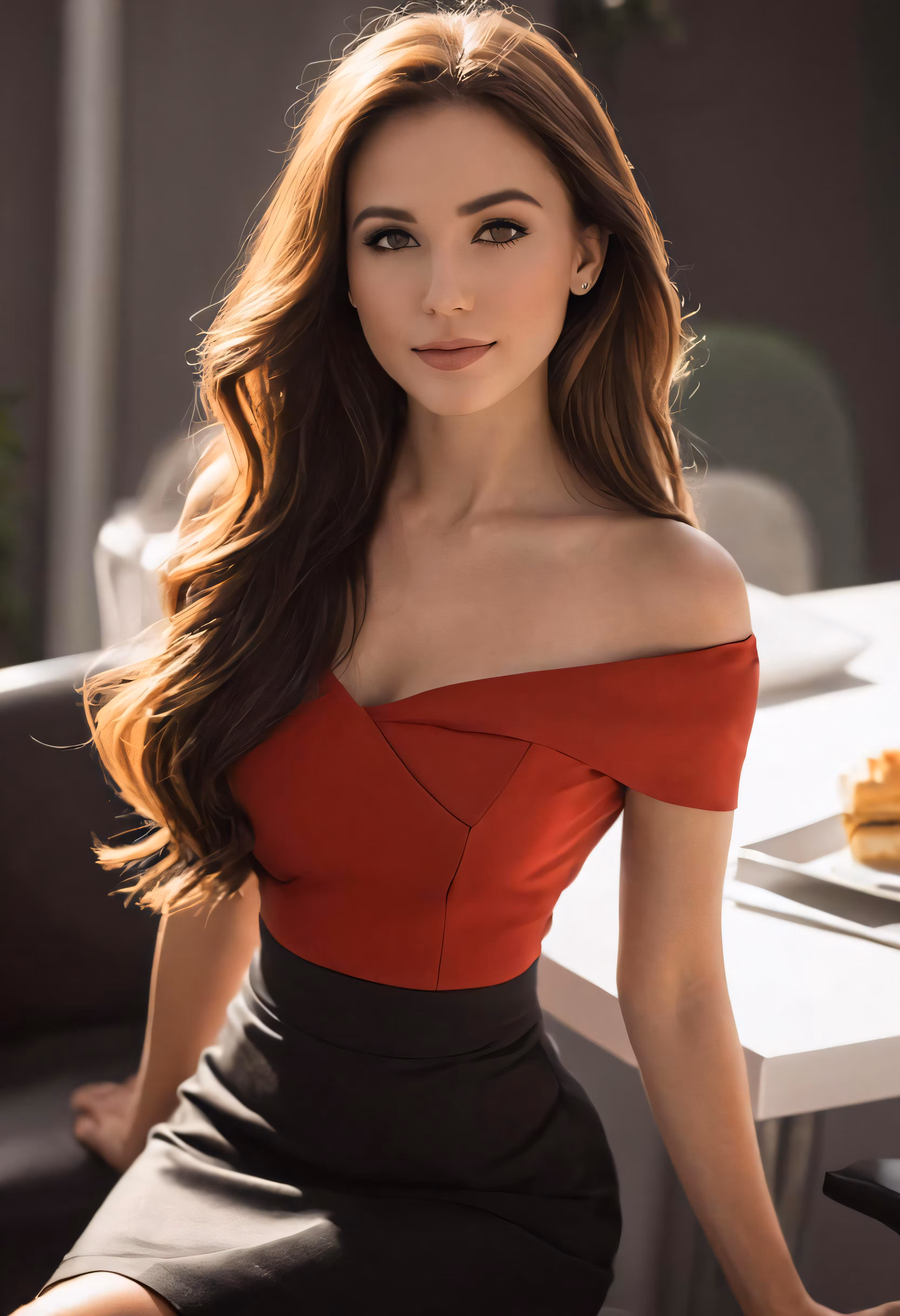 High resolution picture, free to use, a woman posing at a table wearing a red and black dress