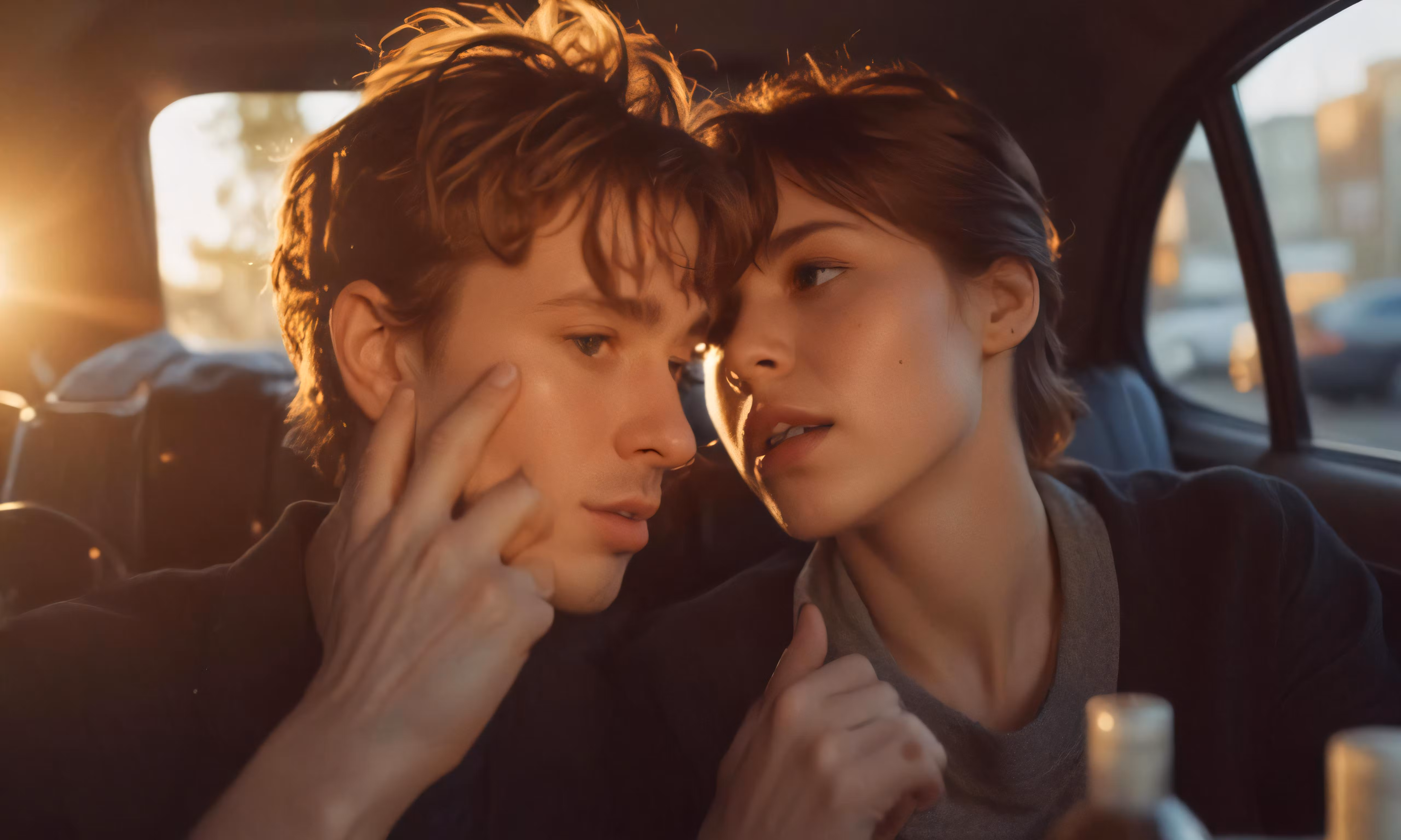 High resolution picture, free to use, a woman puts her face next to a man in the backseat