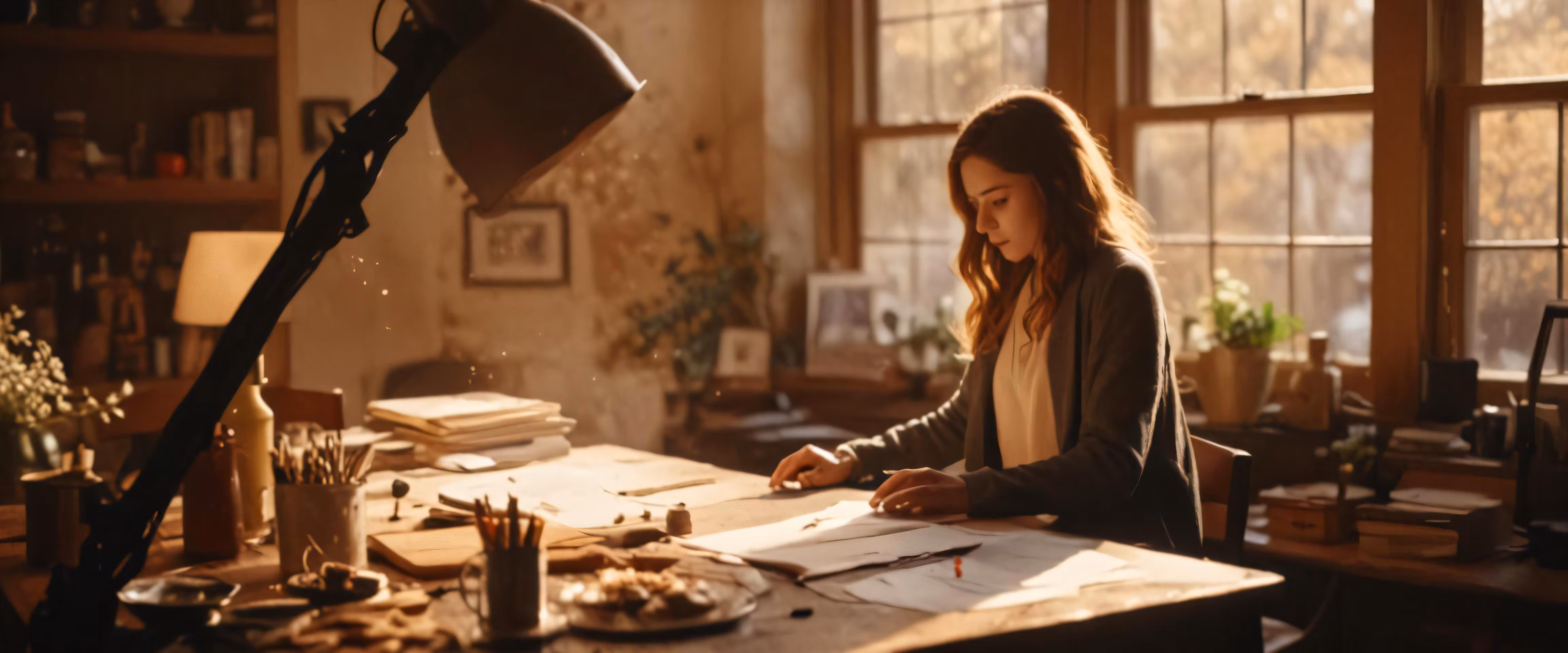 High resolution picture, free to use, a woman sits at a desk working with paper