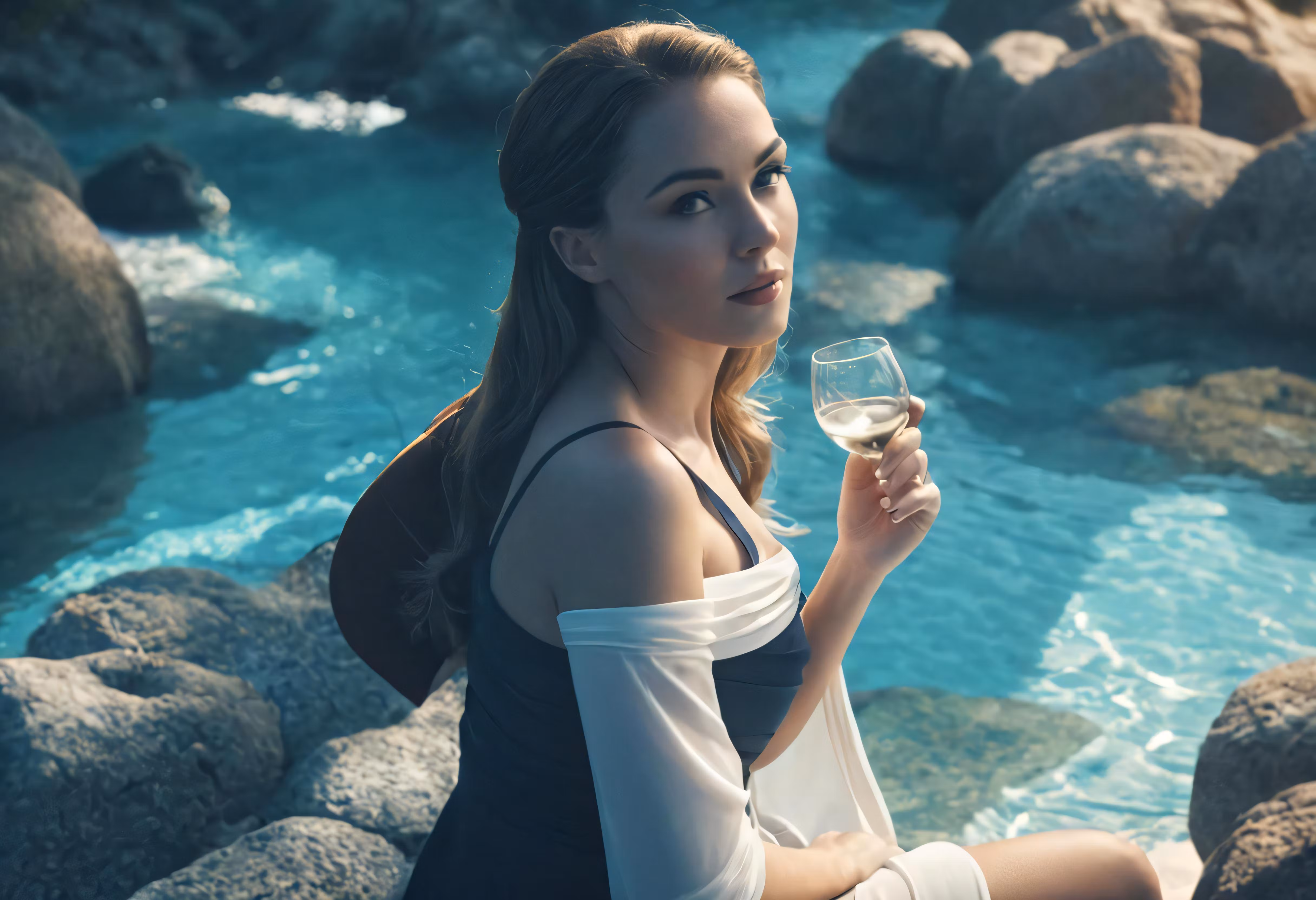 High resolution picture, free to use, a woman sits holding a glass of wine
