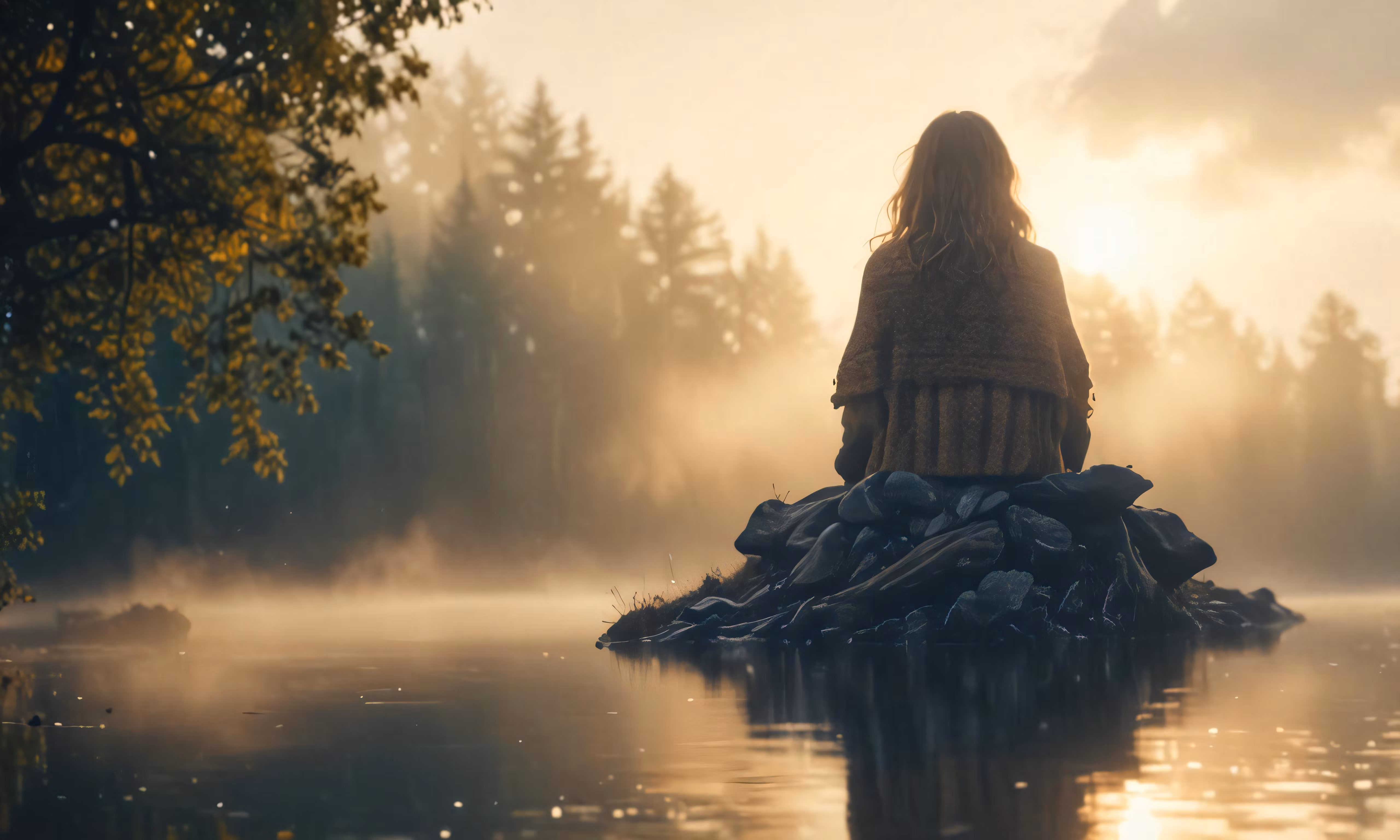 High resolution picture, free to use, a woman sits on the edge of a lake as the sun rises