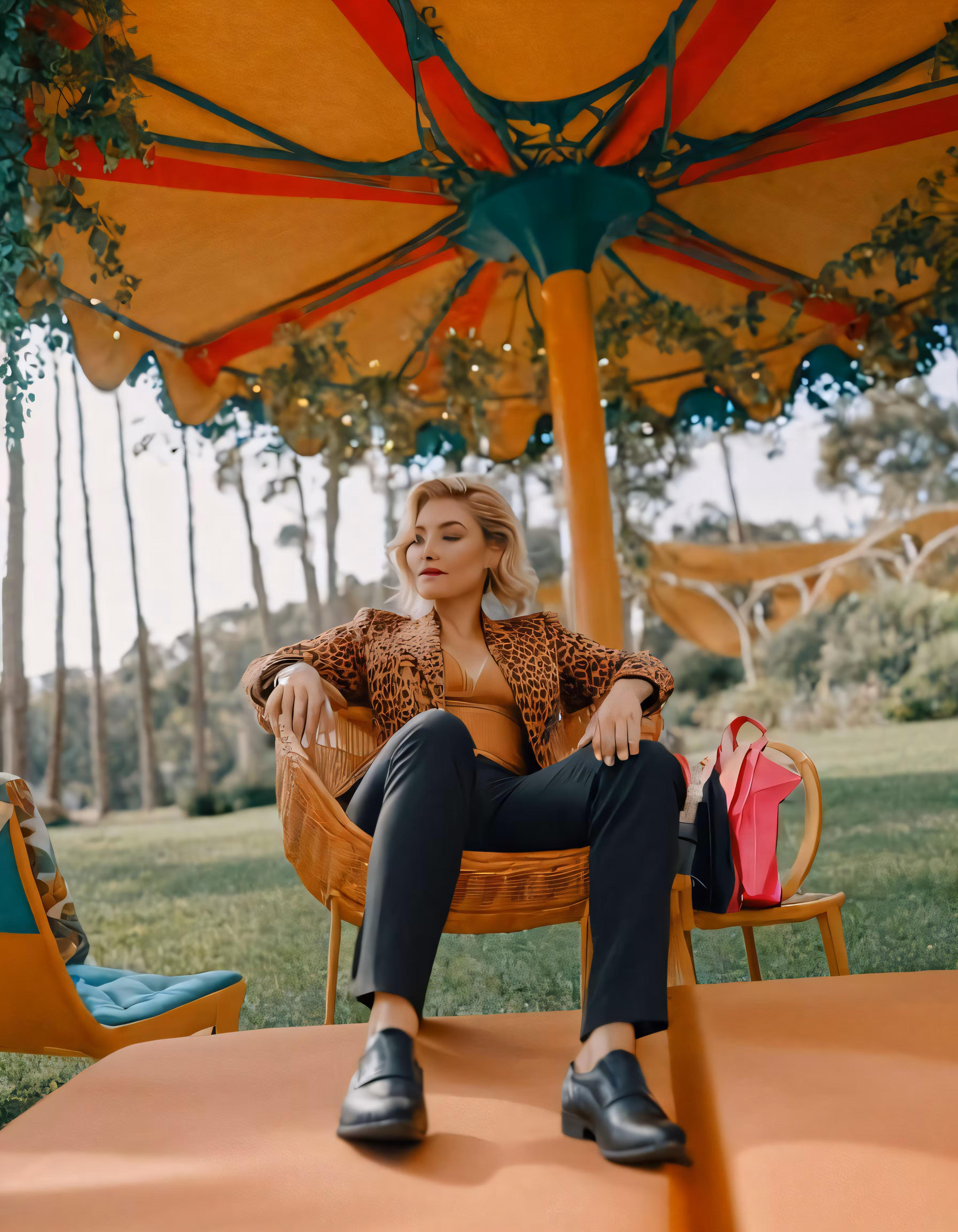 High resolution picture, free to use, a woman sits on top of a chair under an umbrella