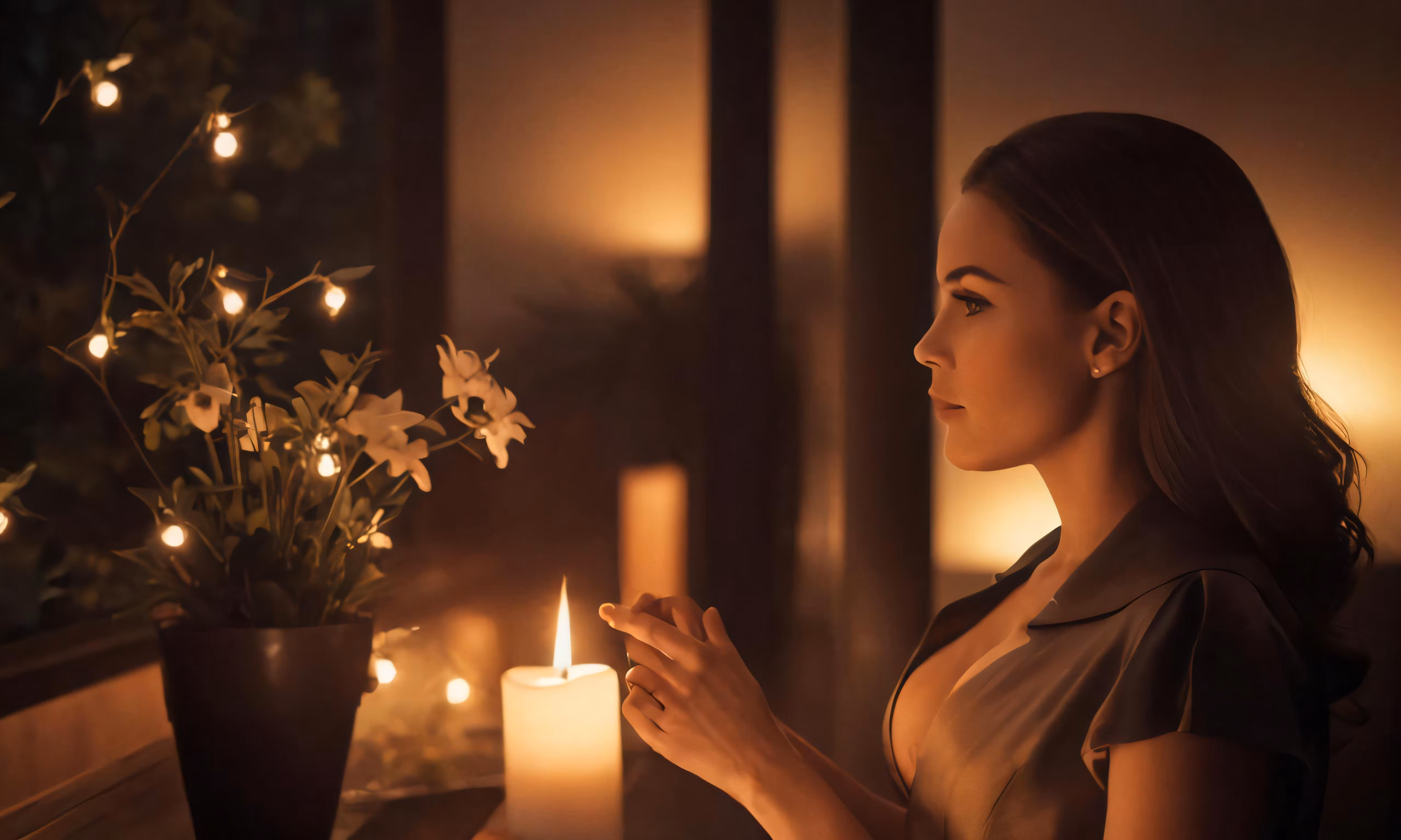 High resolution picture, free to use, a woman sitting at a table holding a lit candle