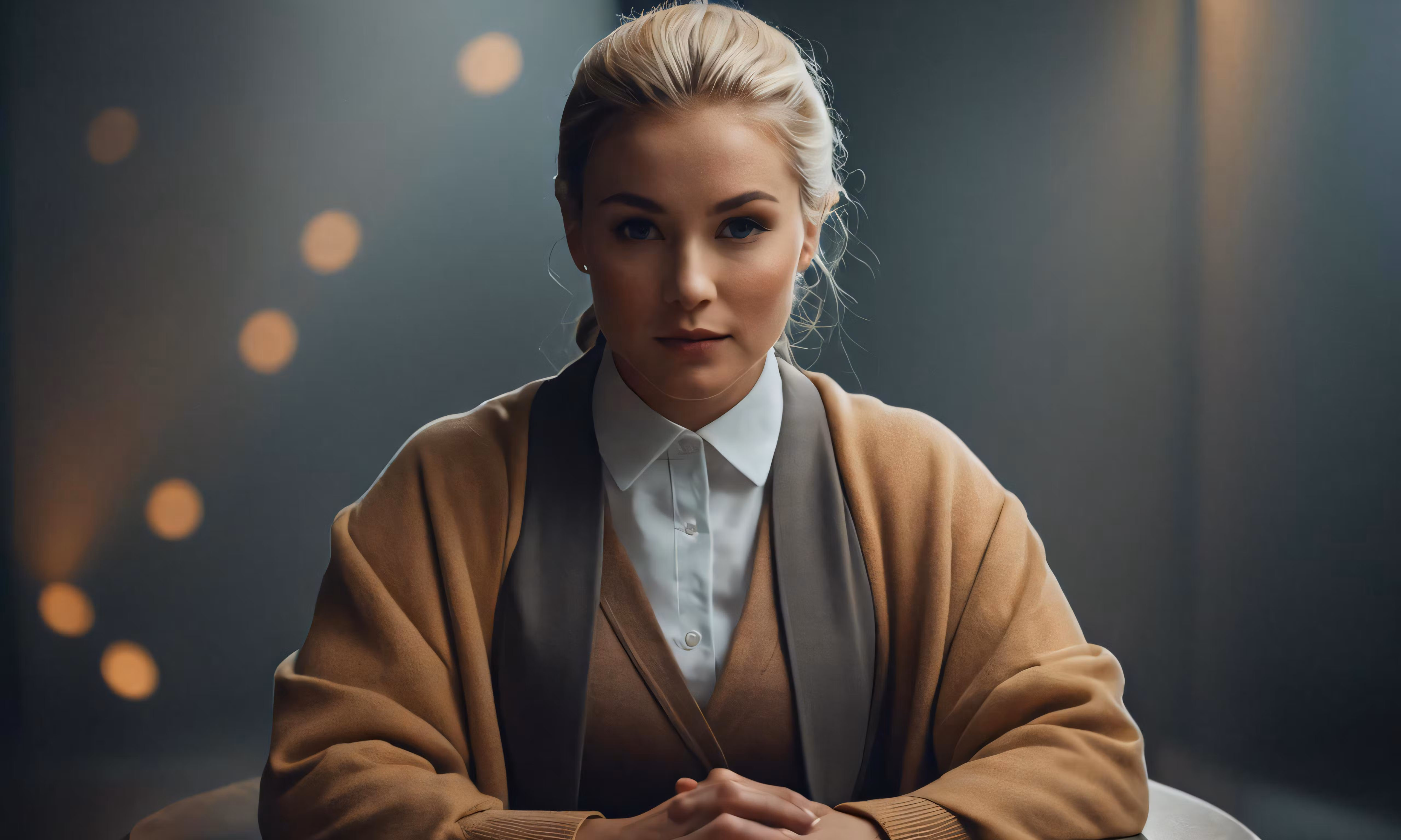 High resolution picture, free to use, a woman sitting at a table with her hands on her knees