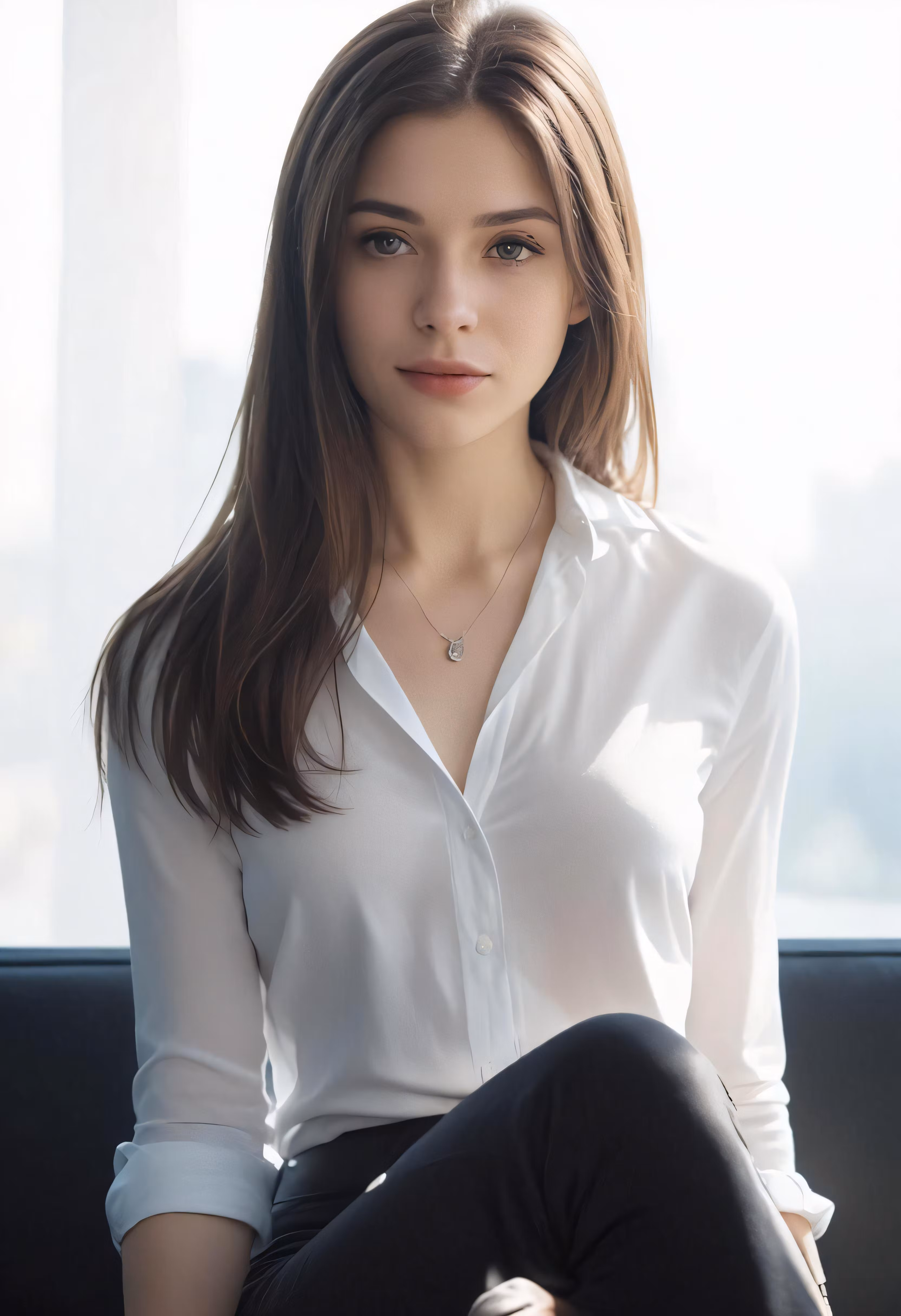 High resolution picture, free to use, a woman sitting in a black chair wearing a white shirt and black pants
