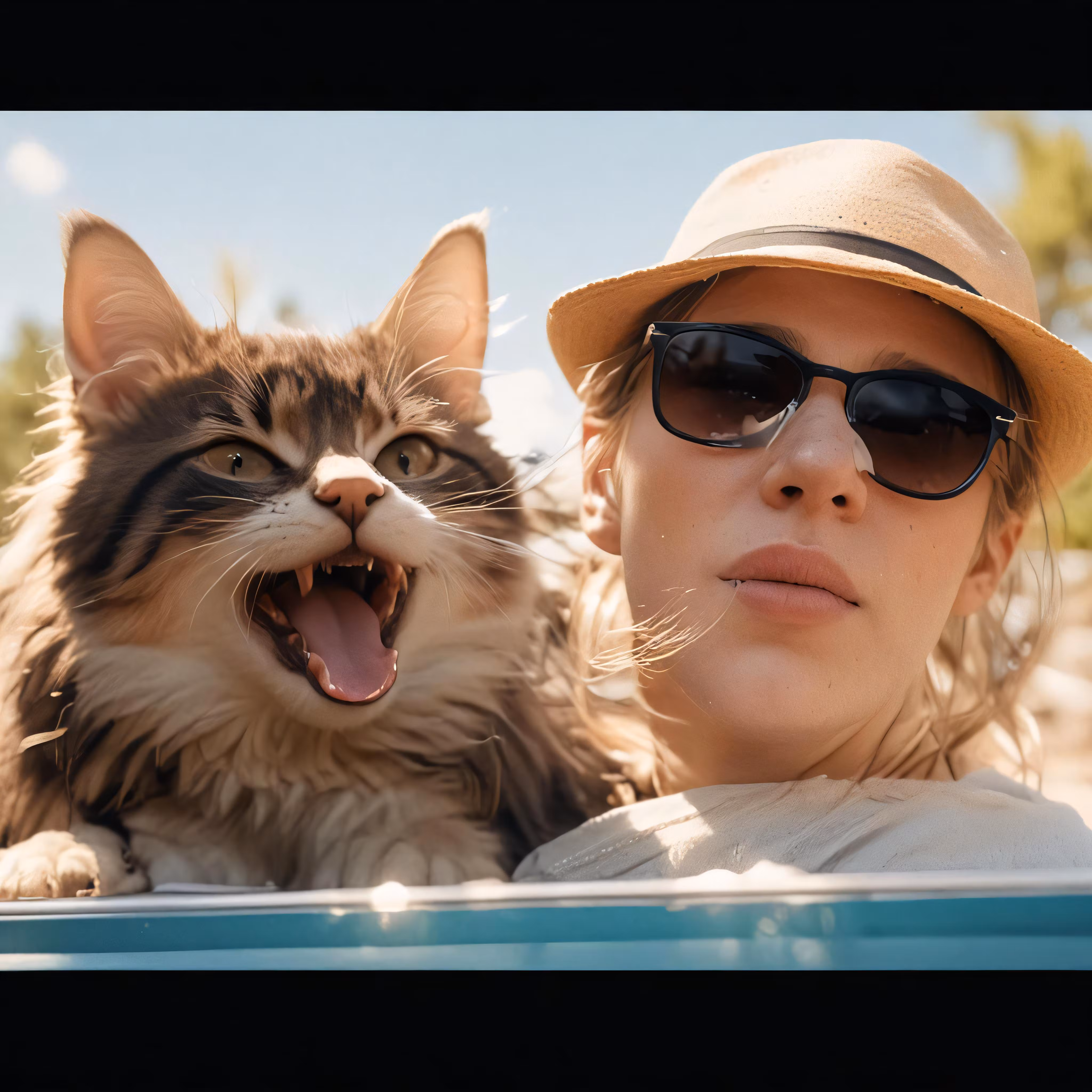 High resolution picture, free to use, a woman sitting in a car while holding up a cat