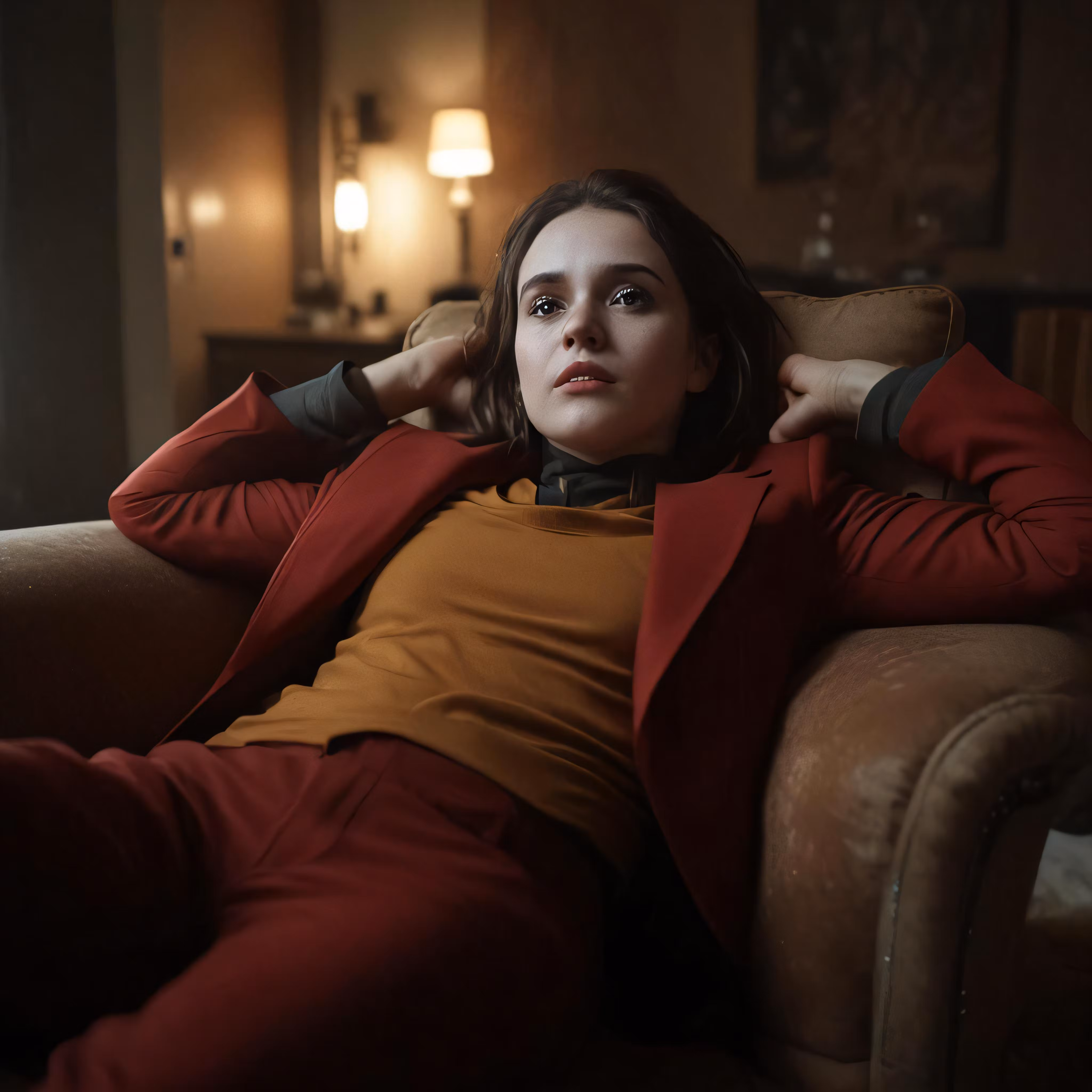 High resolution picture, free to use, a woman sitting in a couch wearing a red jacket