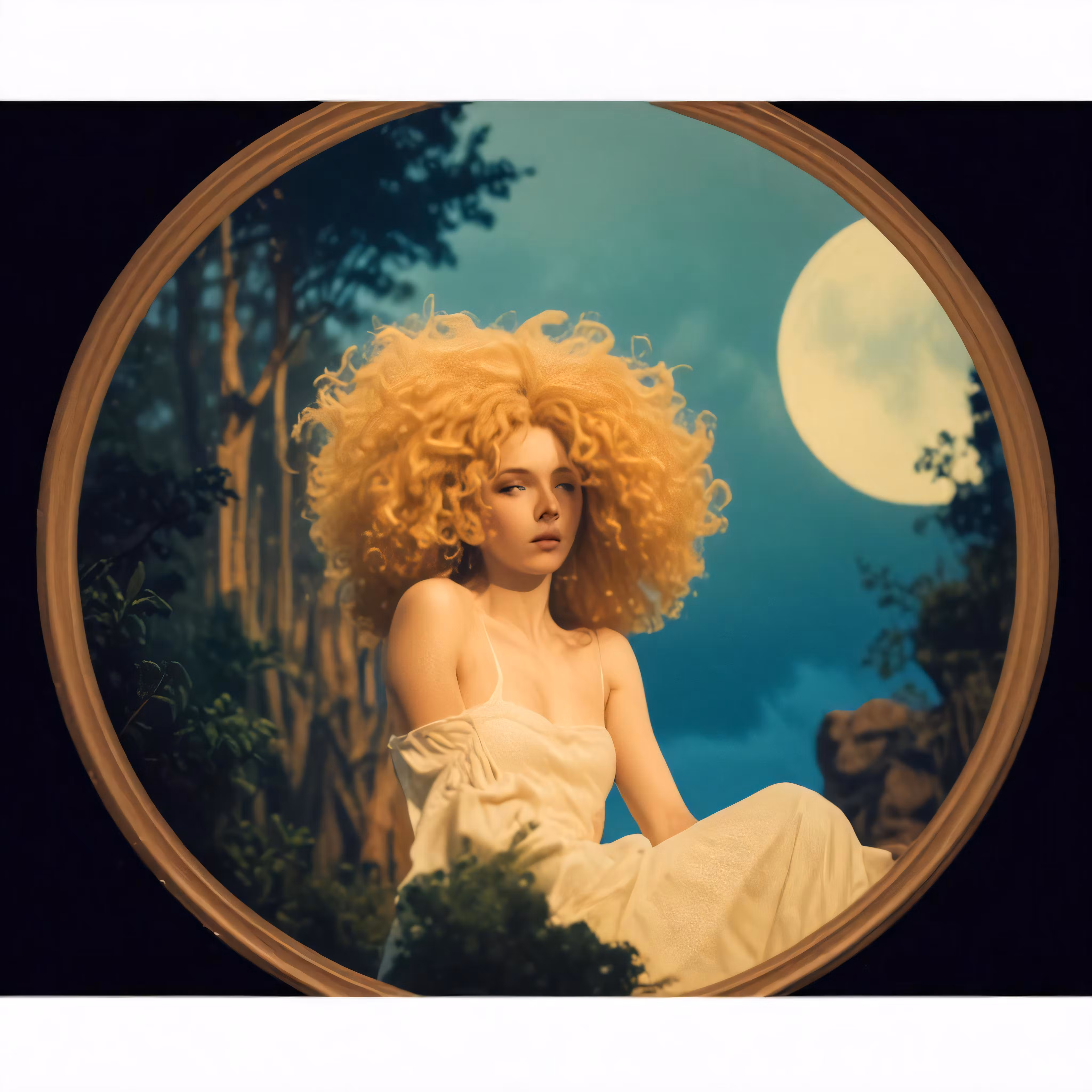 High resolution picture, free to use, a woman sitting in a forest, with blonde hair