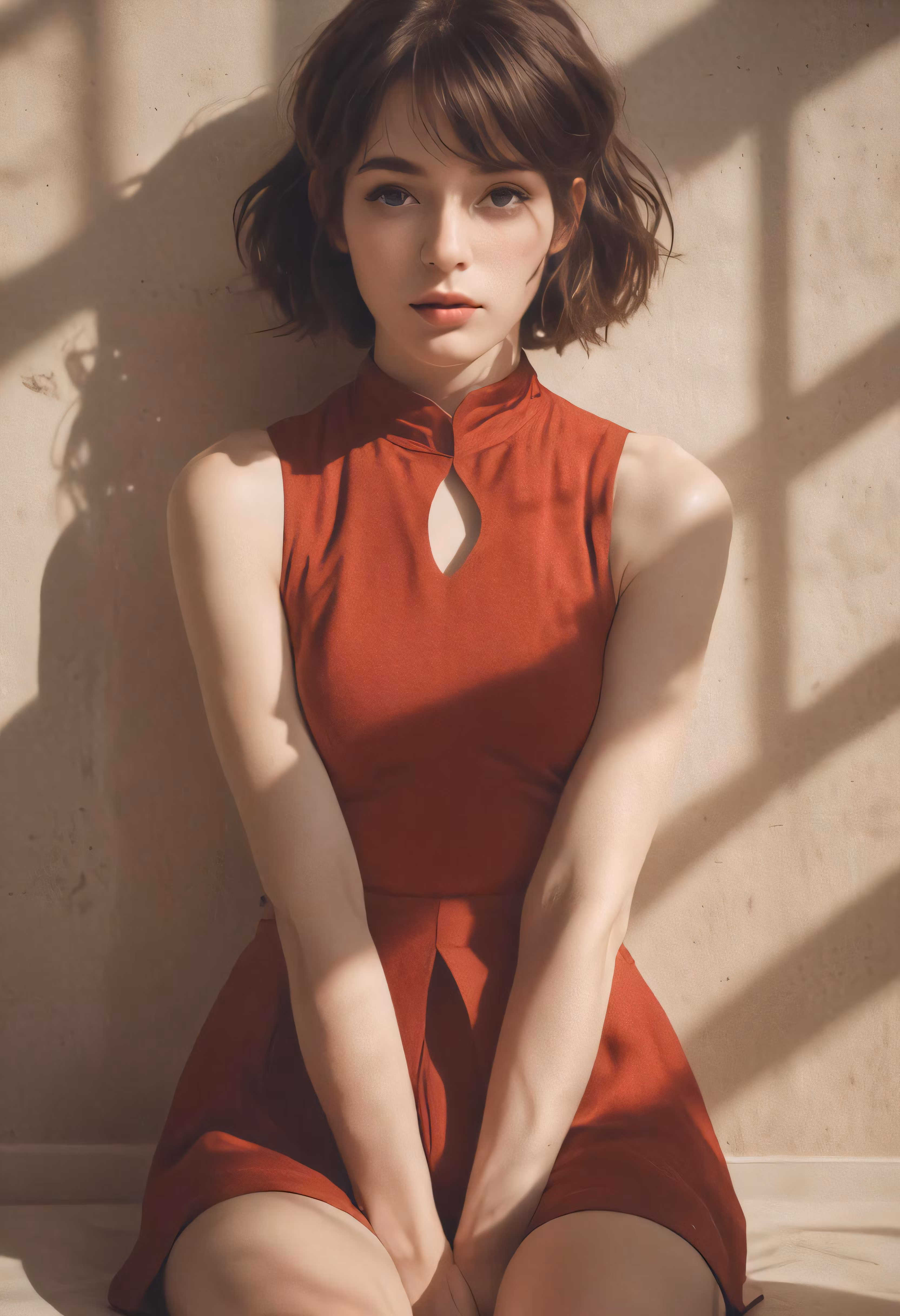 High resolution picture, free to use, a woman sitting in a room wearing an orange dress