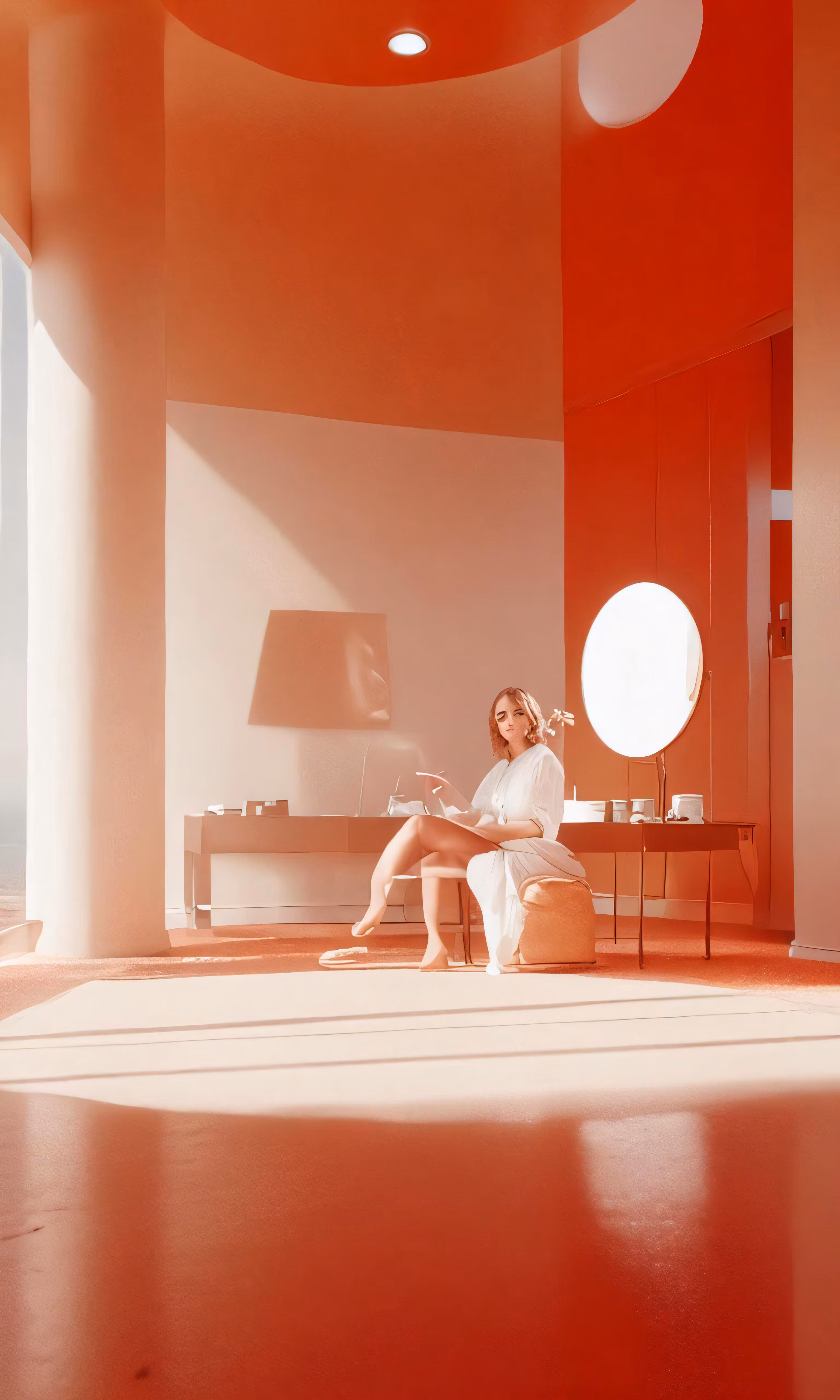High resolution picture, free to use, a woman sitting in front of a red and white wall