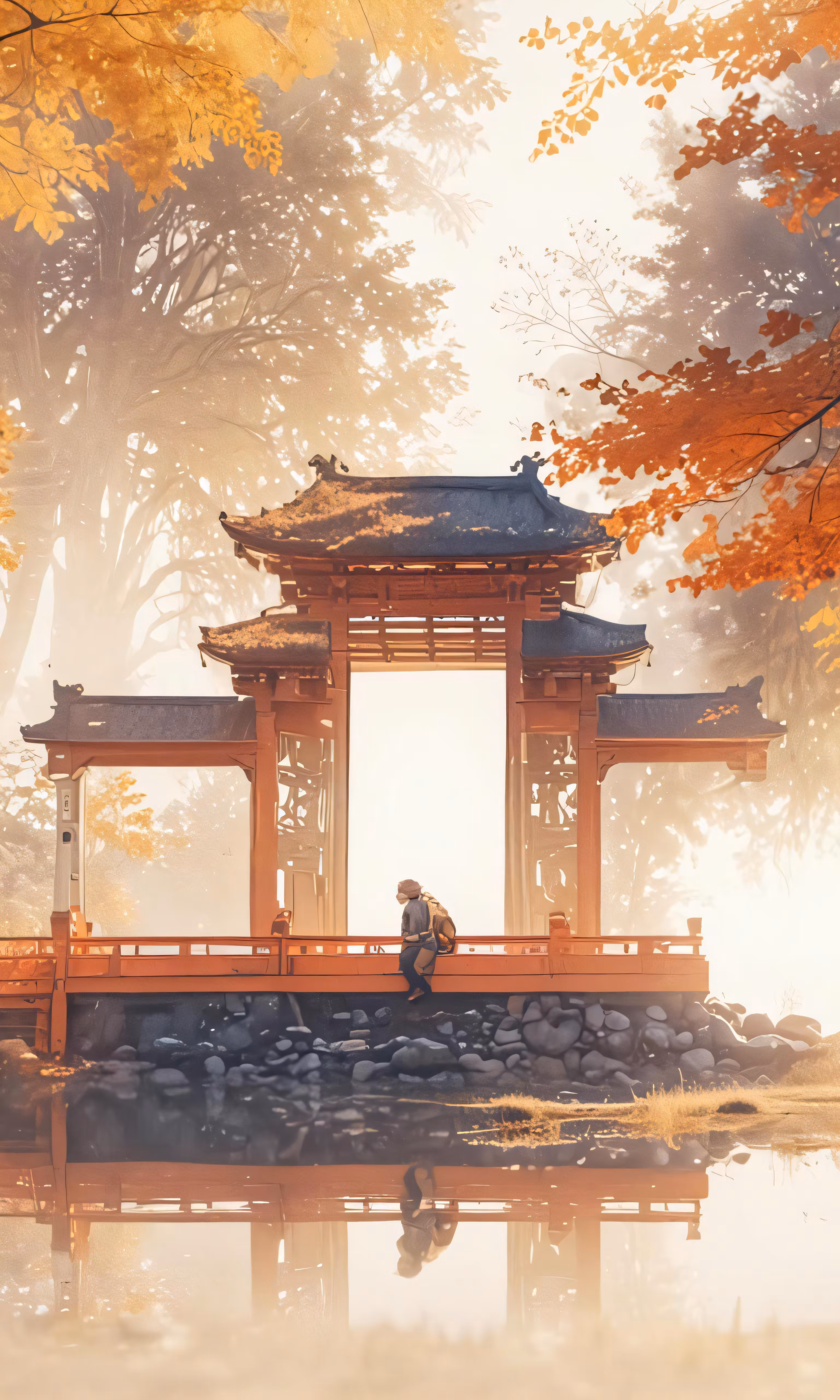 High resolution picture, free to use, a woman sitting in front of a small pavilion near water