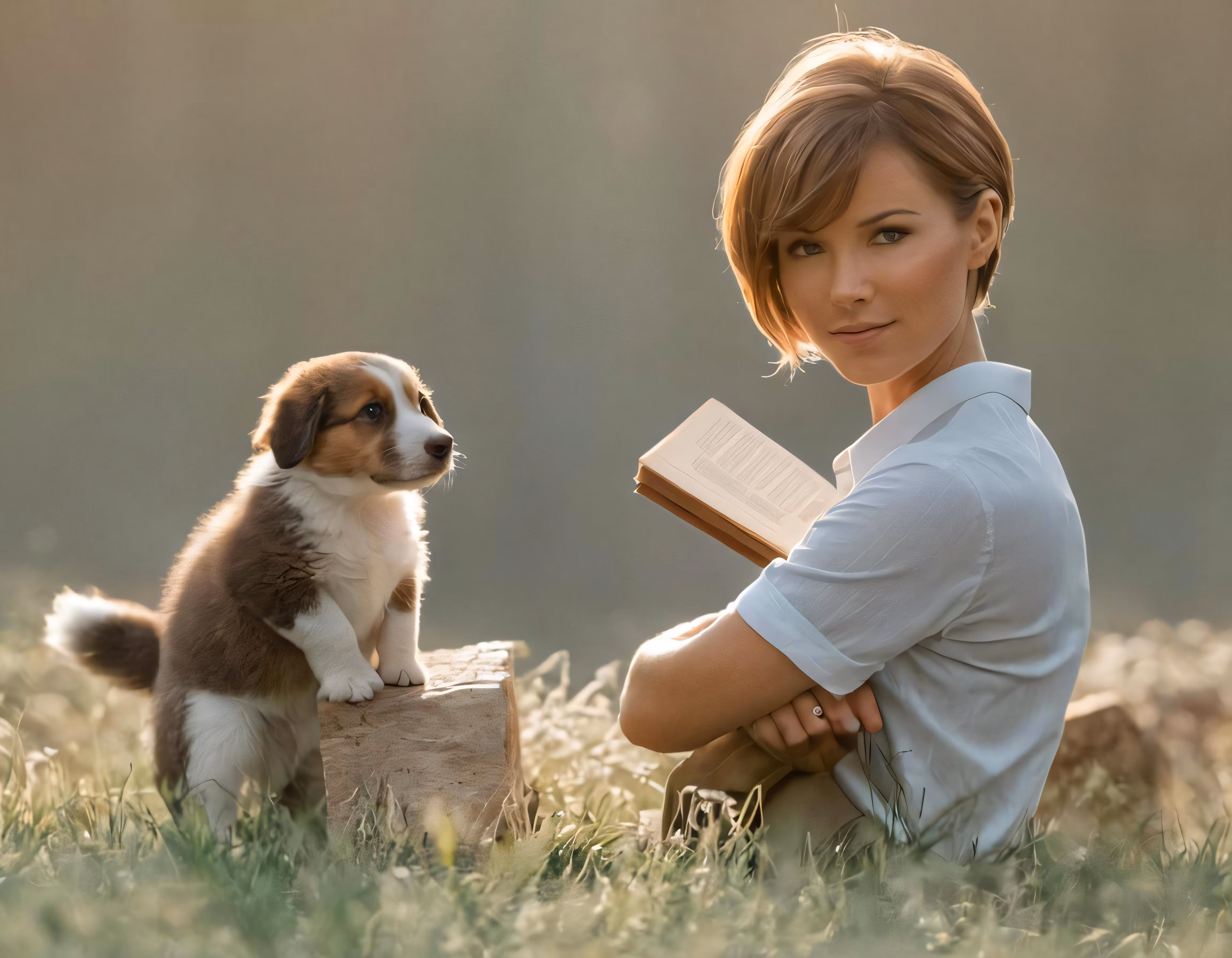 High resolution picture, free to use, a woman sitting in the grass next to a brown and white dog