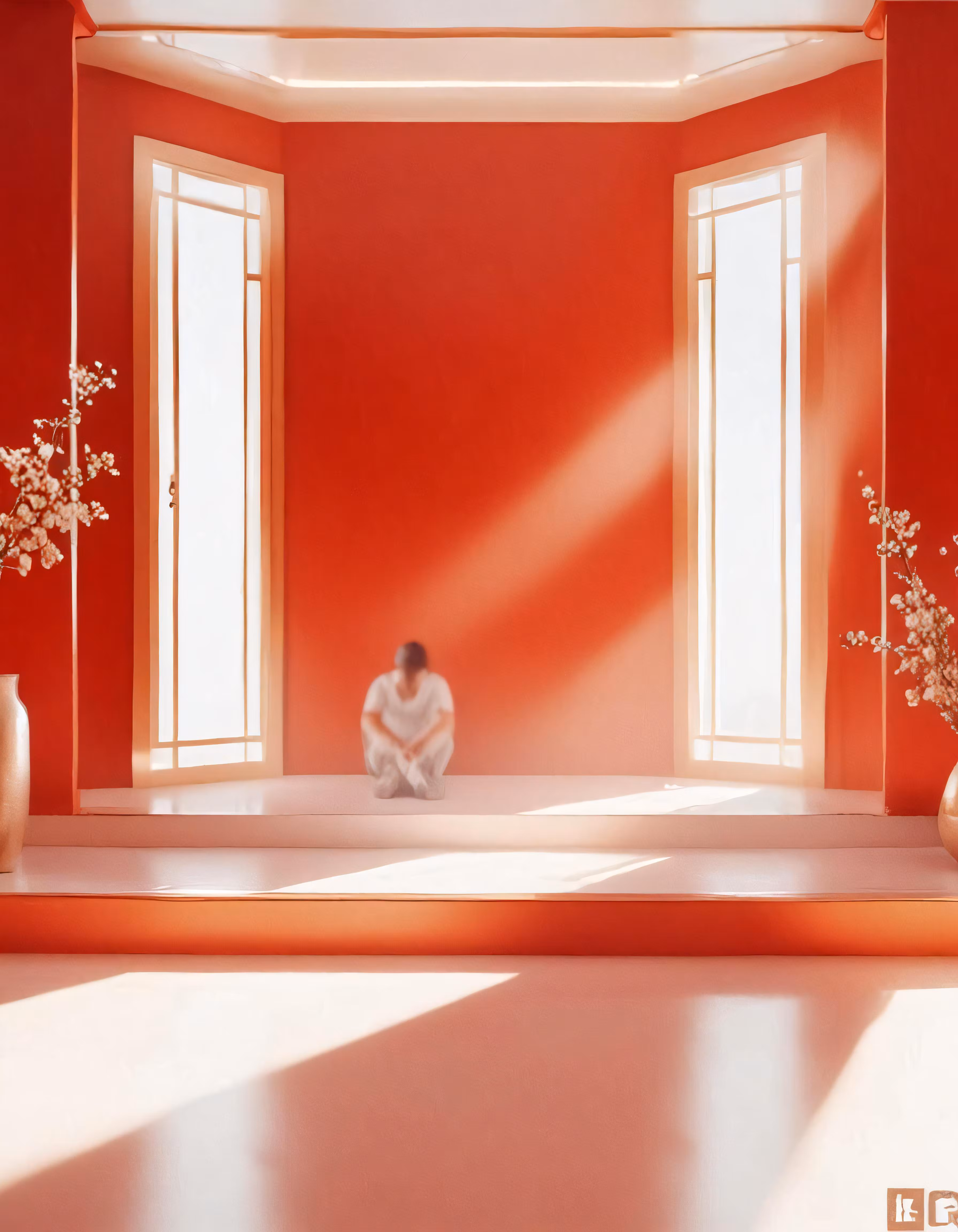 High resolution picture, free to use, a woman sitting in the middle of the room with two windows and red walls