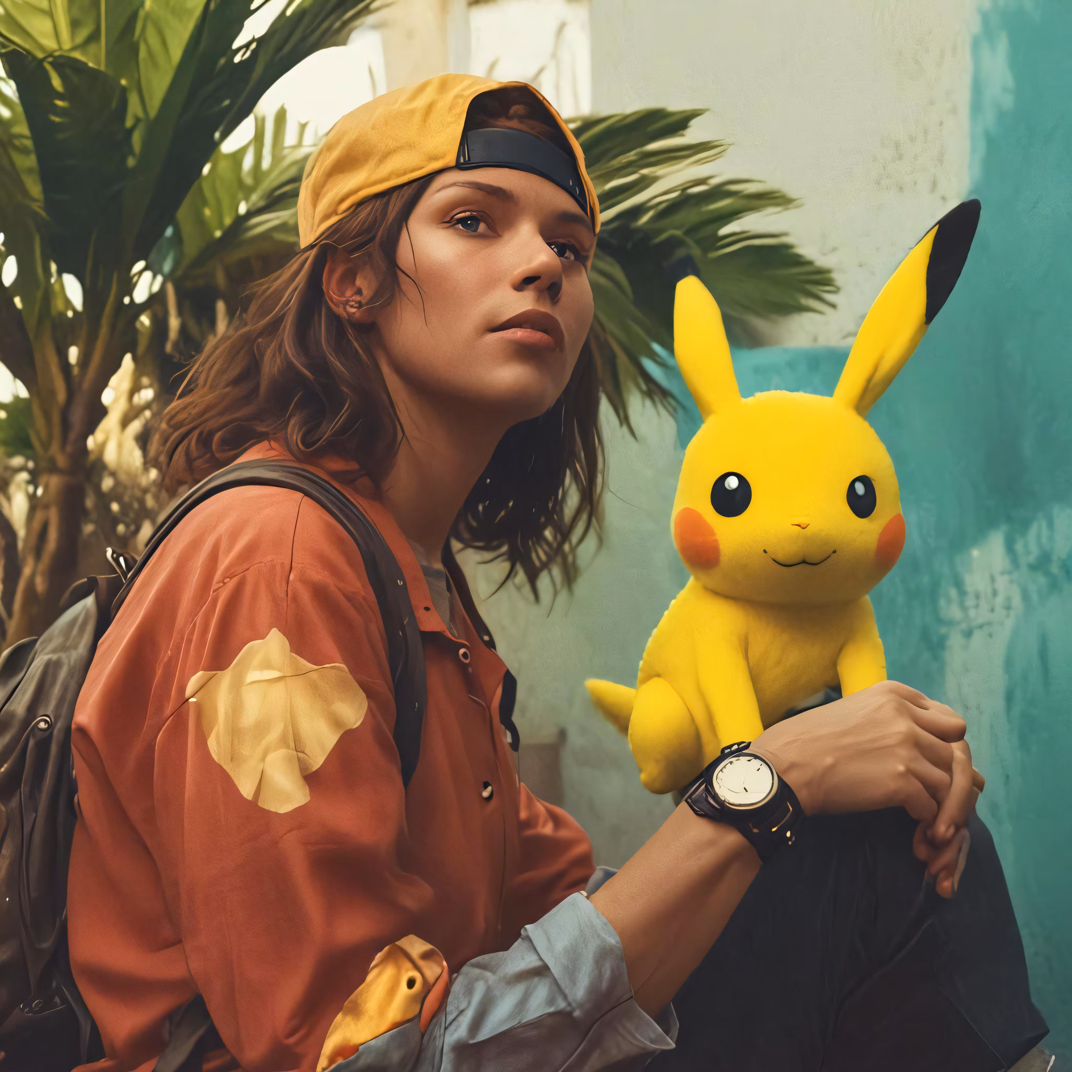 High resolution picture, free to use, a woman sitting next to a stuffed animal holding a pikachu