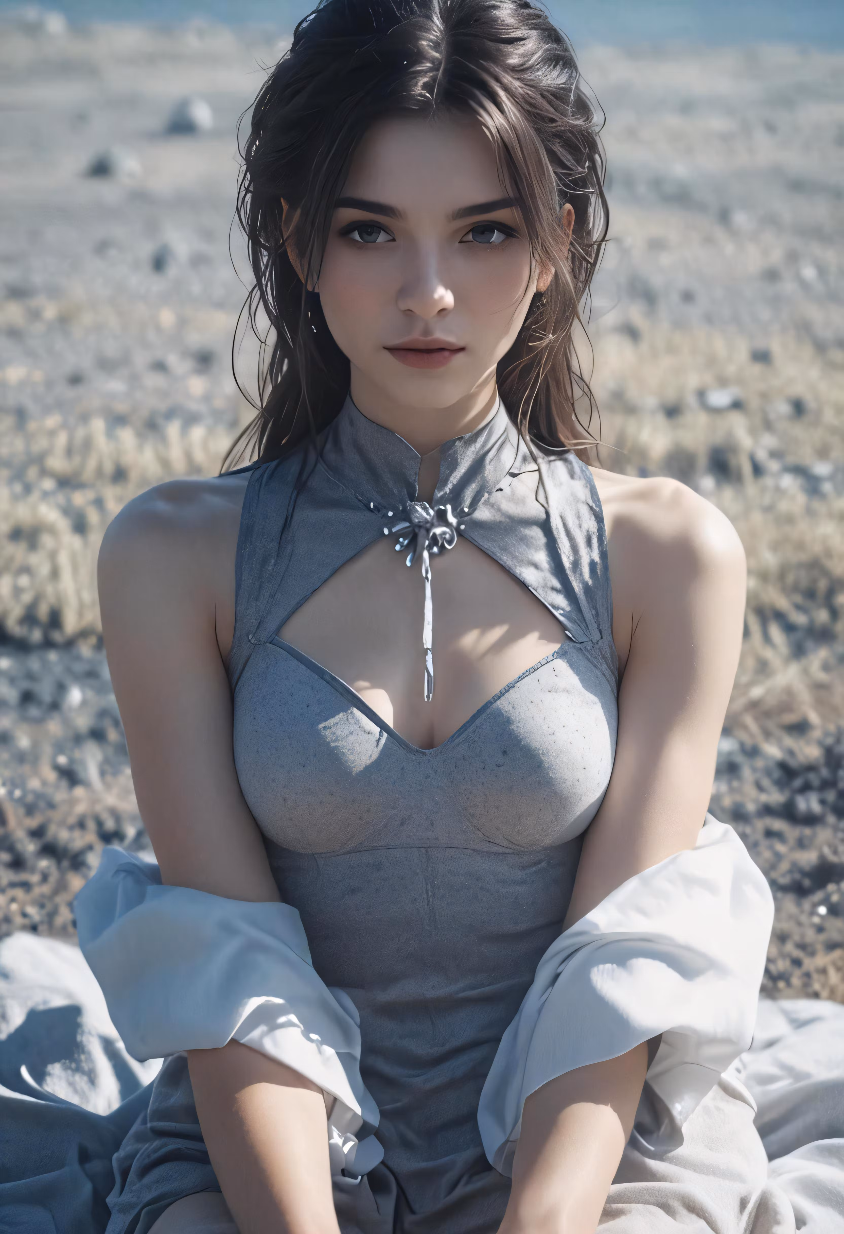 High resolution picture, free to use, a woman sitting on the beach in a dress