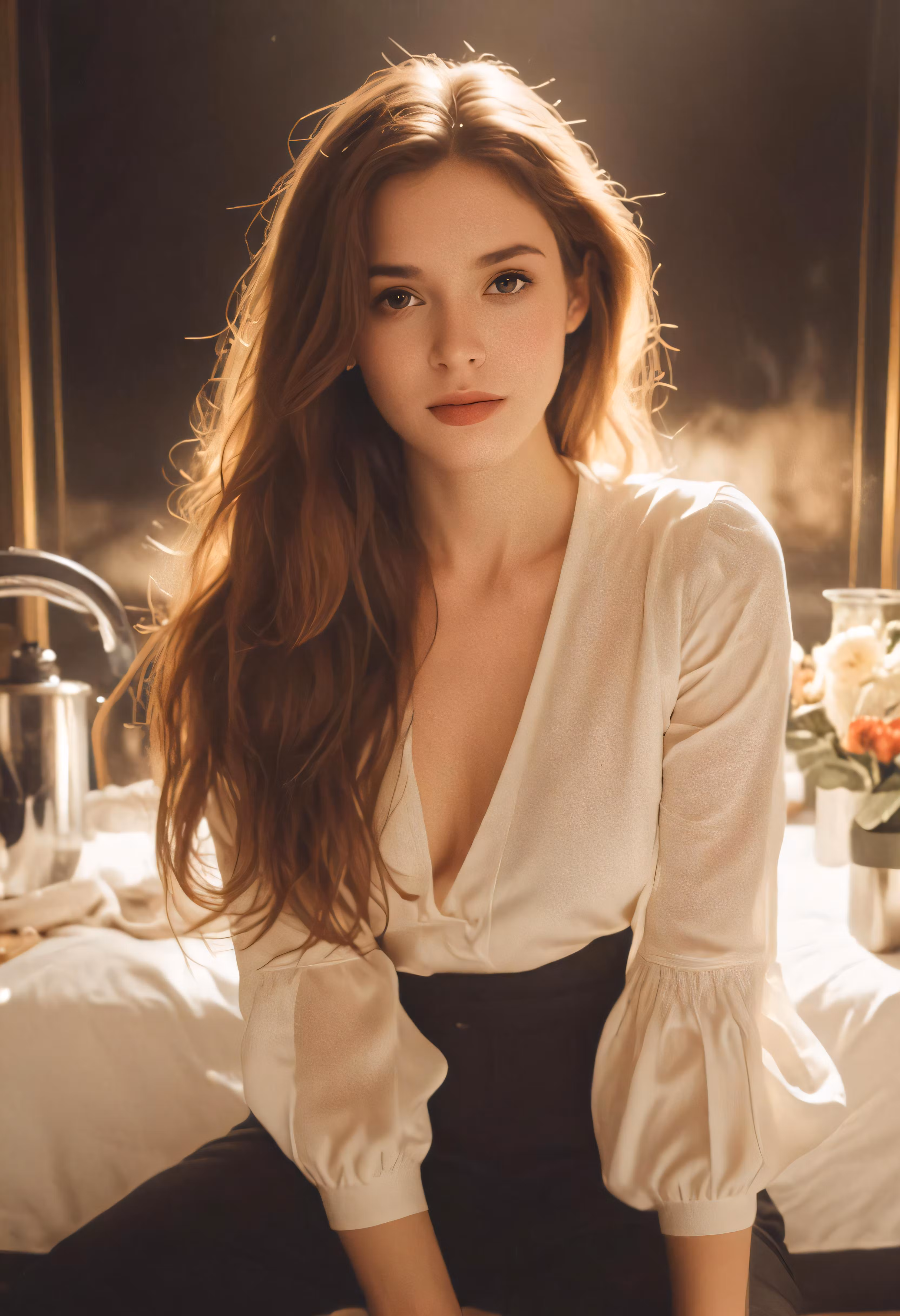 High resolution picture, free to use, a woman sitting on the bed with long red hair