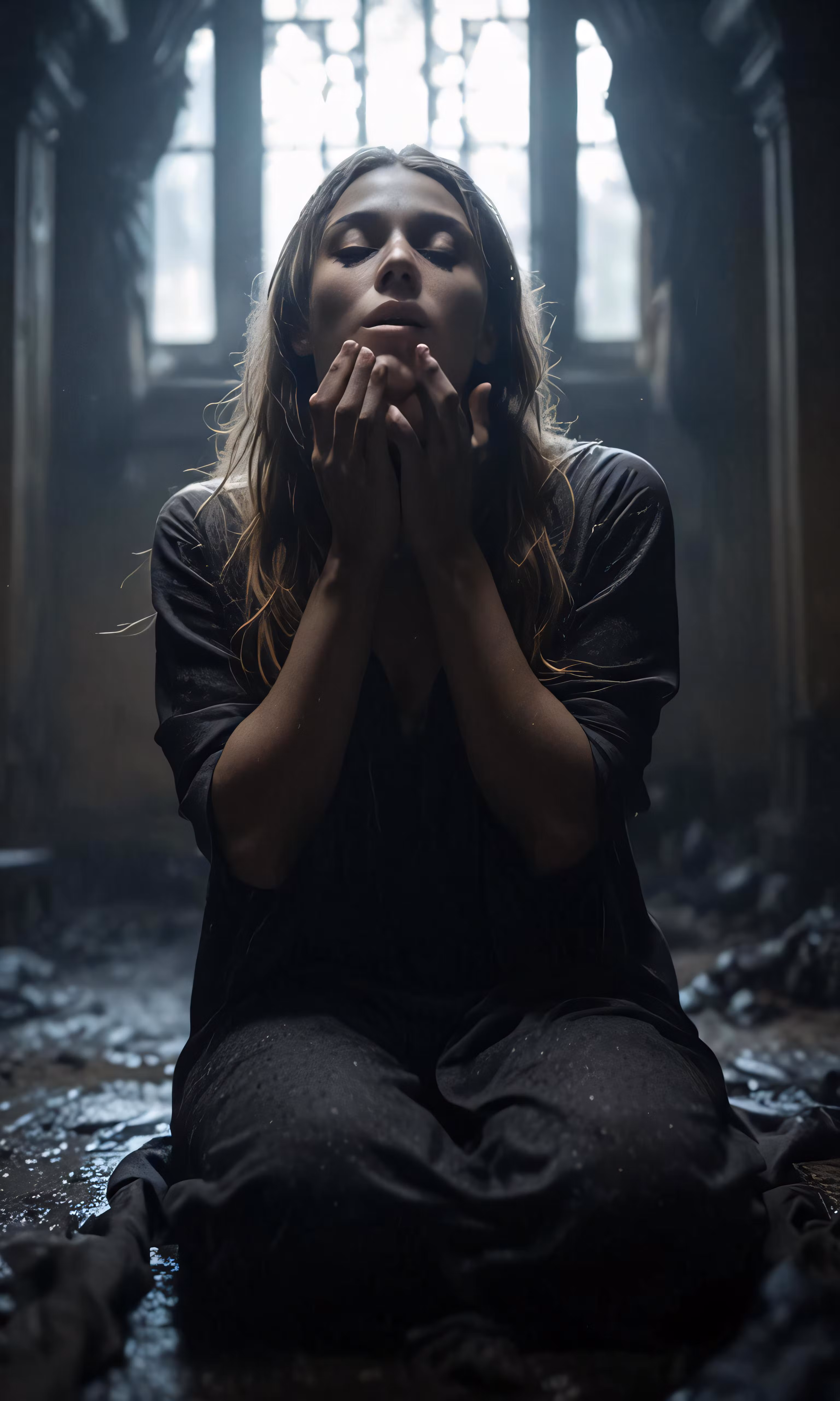 High resolution picture, free to use, a woman sitting on the floor praying in an old church