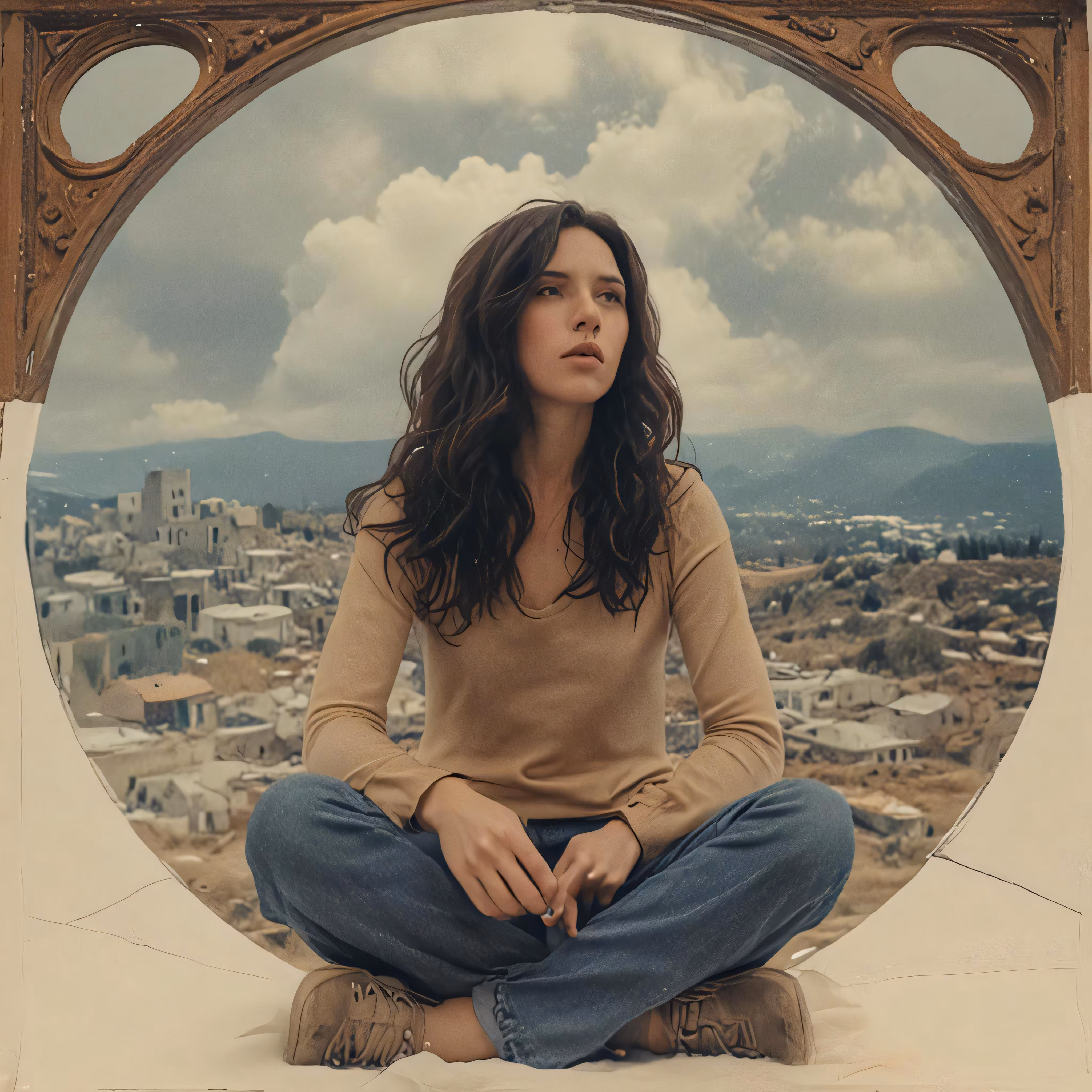 High resolution picture, free to use, a woman sitting on the ground in a round window