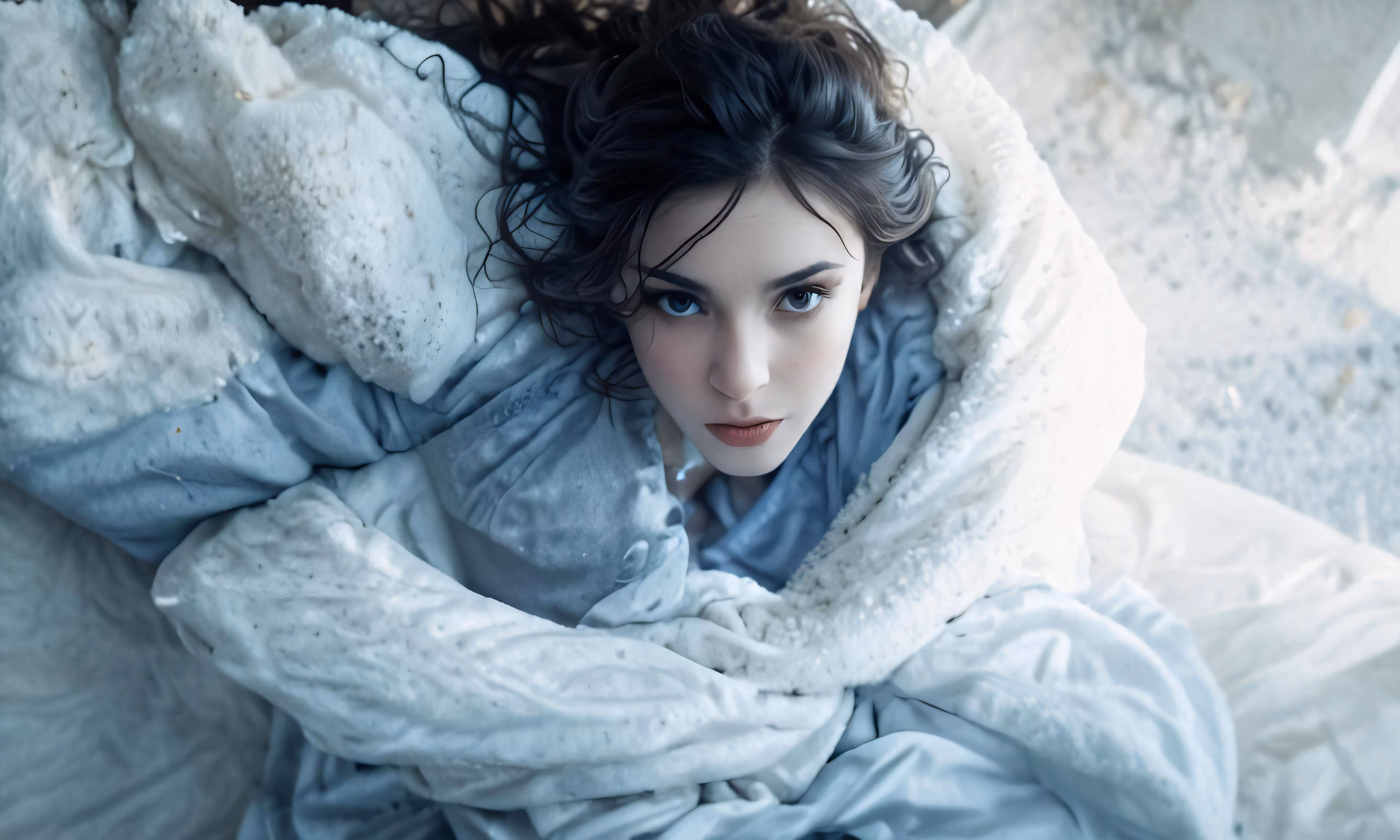 High resolution picture, free to use, a woman sitting on top of a bed covered in blankets