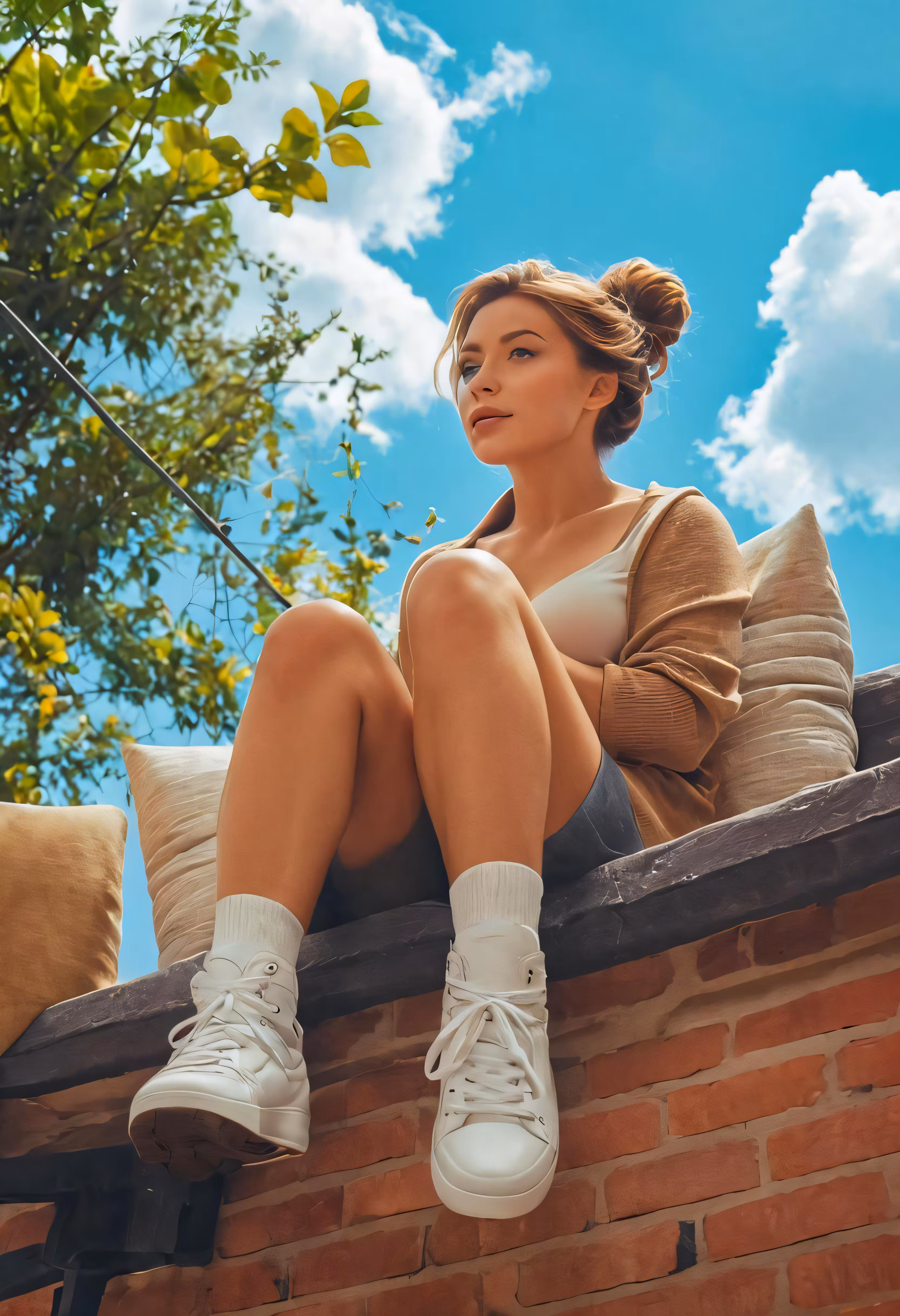 High resolution picture, free to use, a woman sitting on top of a brick building