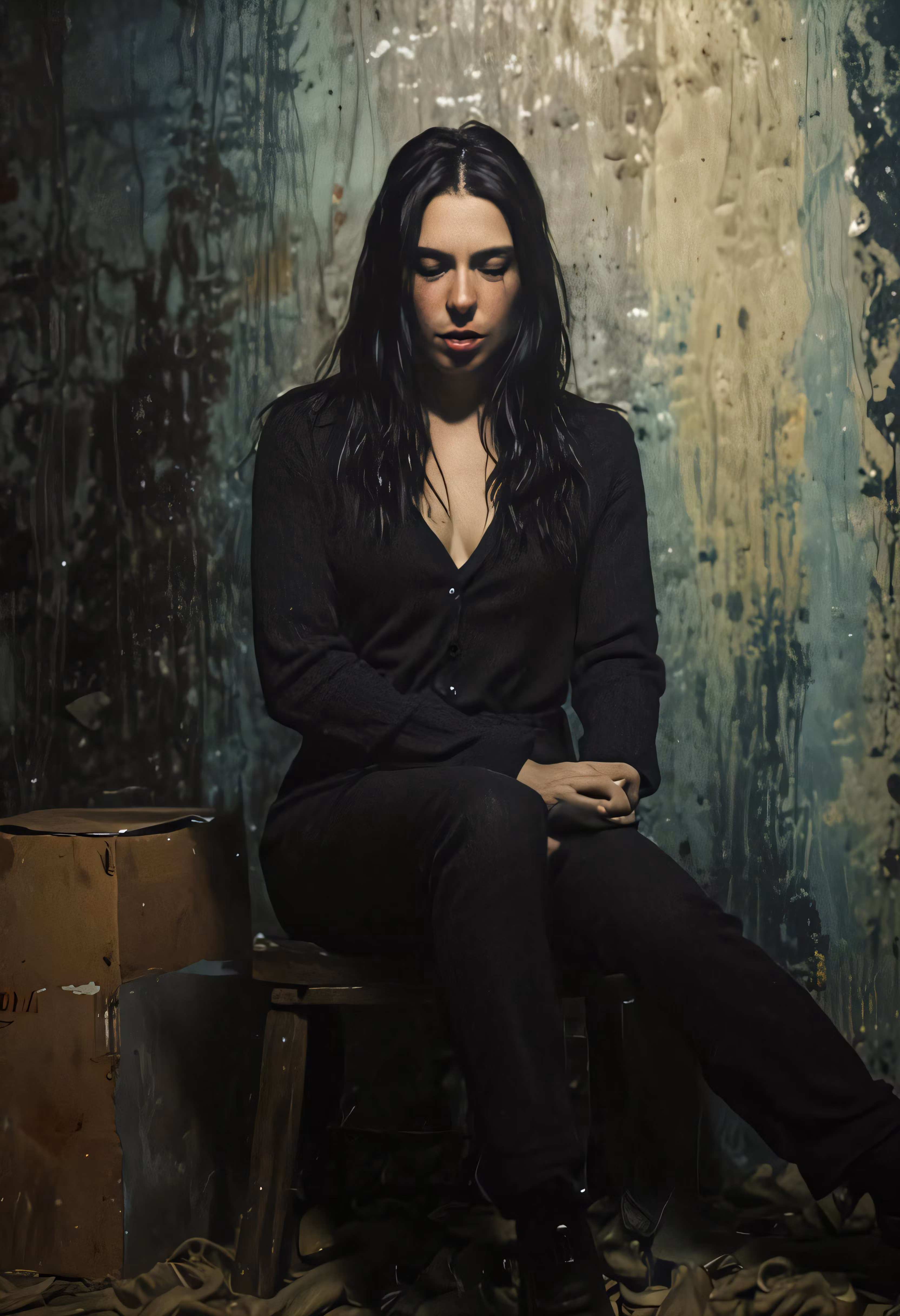 High resolution picture, free to use, a woman sitting on top of a chair with her arms crossed