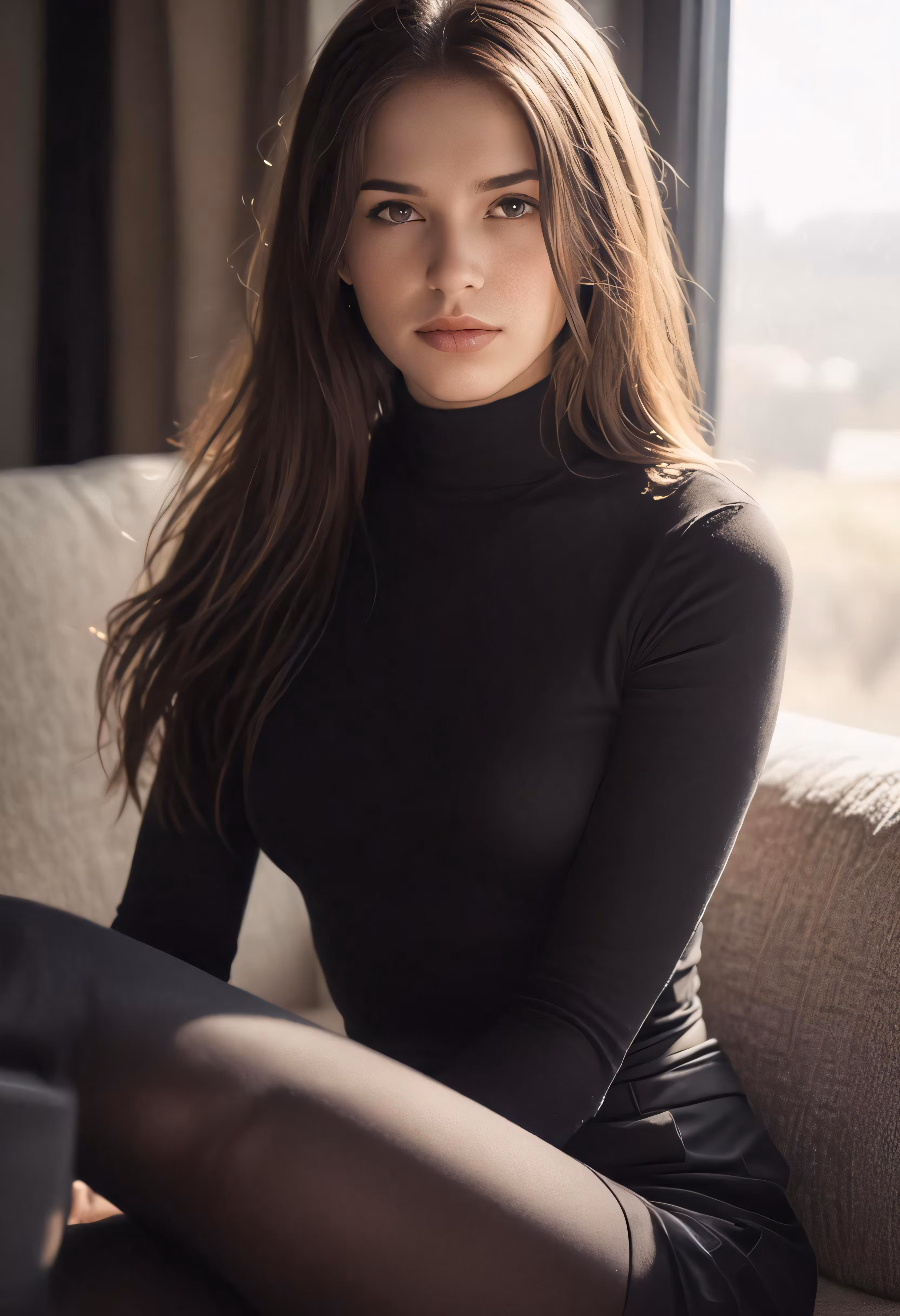 High resolution picture, free to use, a woman sitting on top of a couch in black clothes
