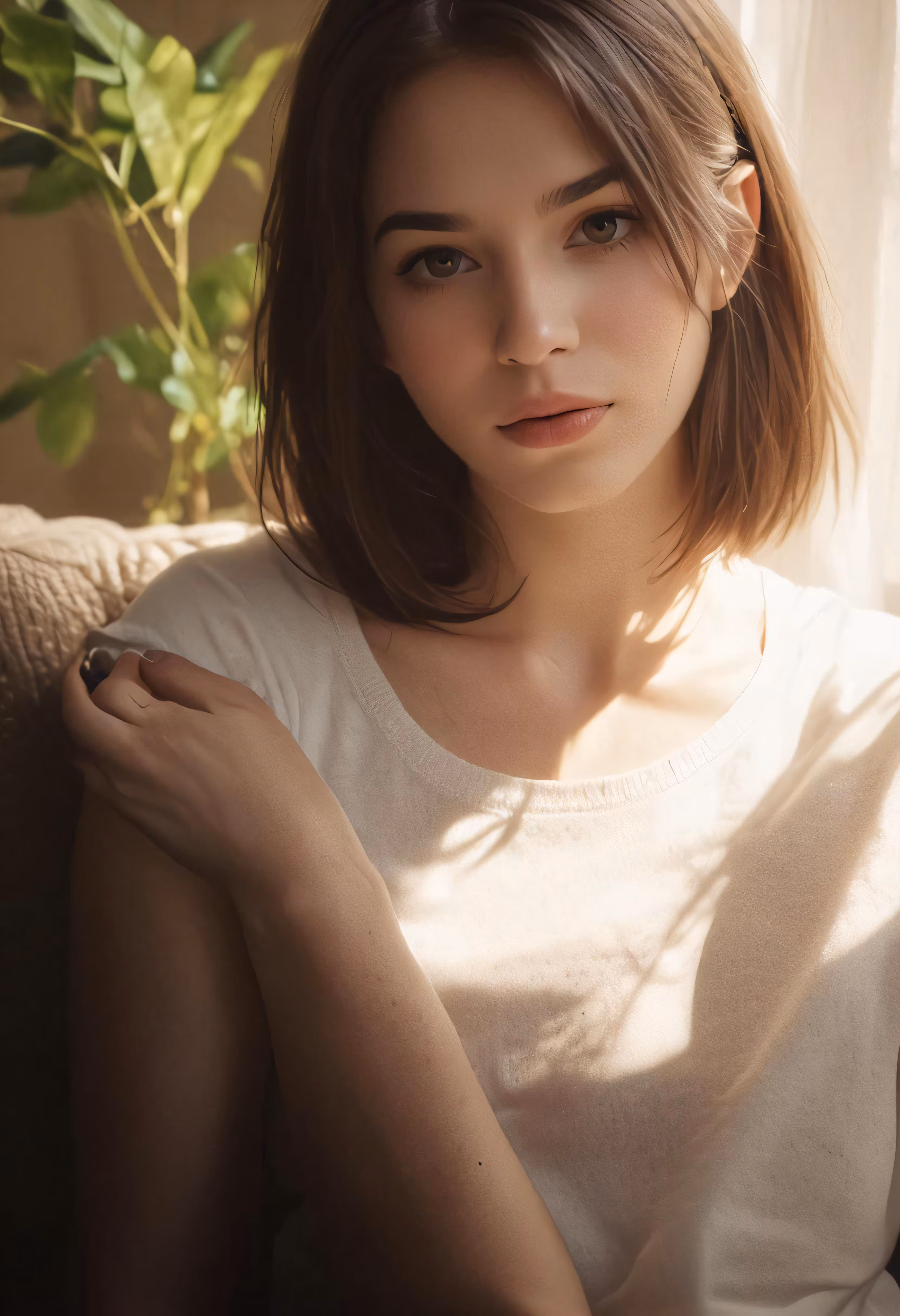 High resolution picture, free to use, a woman sitting on top of a couch near a plant