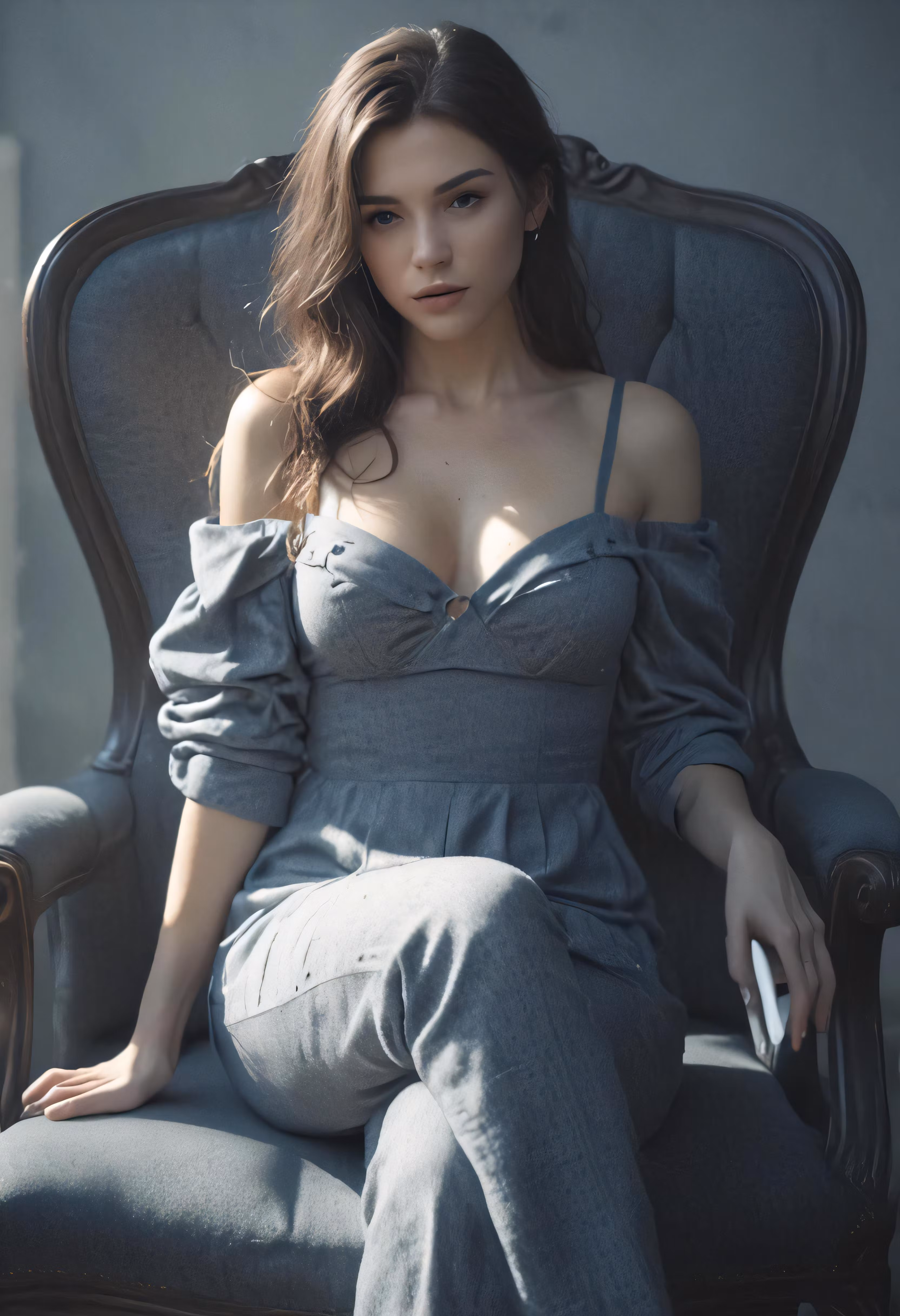 High resolution picture, free to use, a woman sitting on top of a gray chair