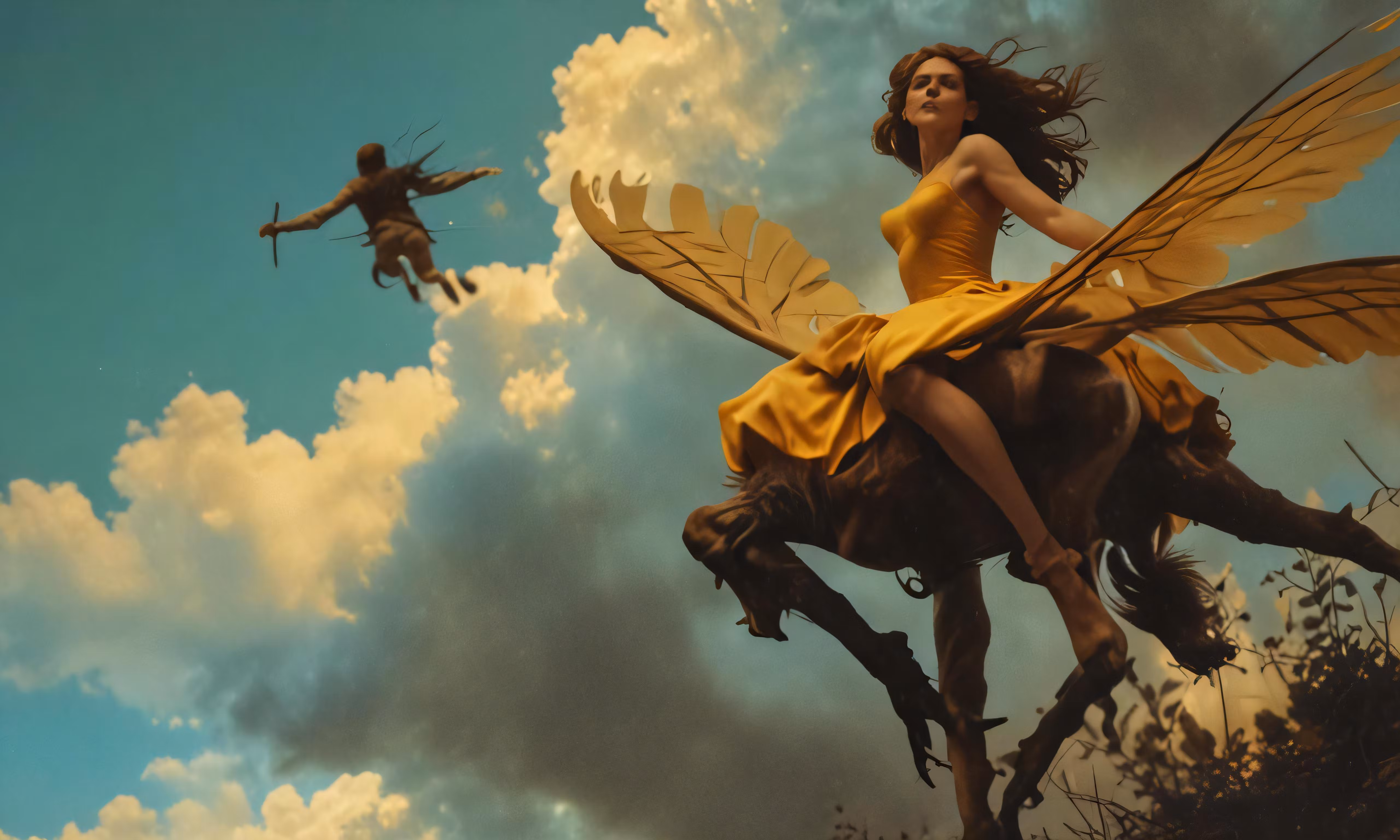 High resolution picture, free to use, a woman sitting on top of a horse near an elephant flying