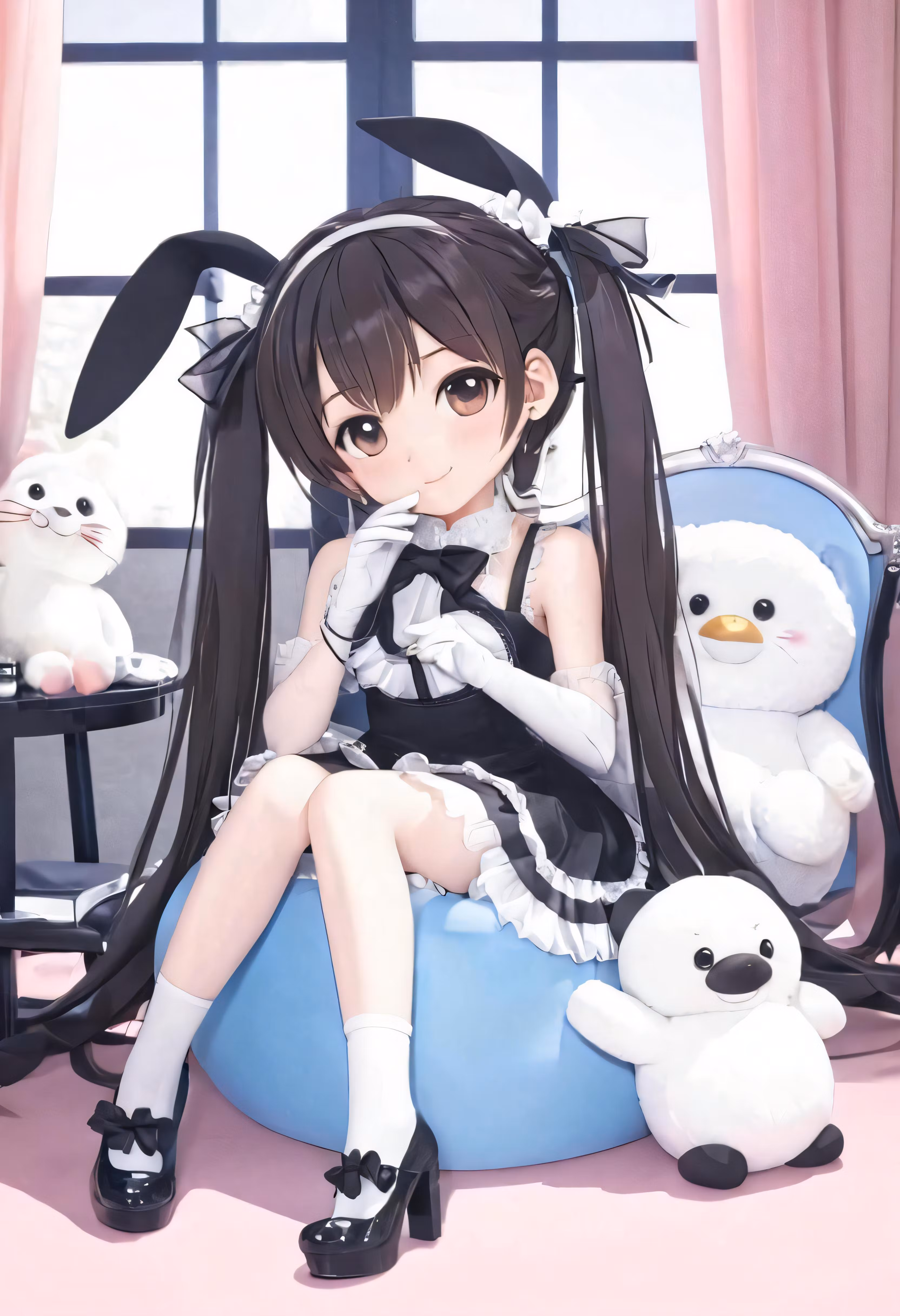 High resolution picture, free to use, a woman sitting on top of a white ball with stuffed animals