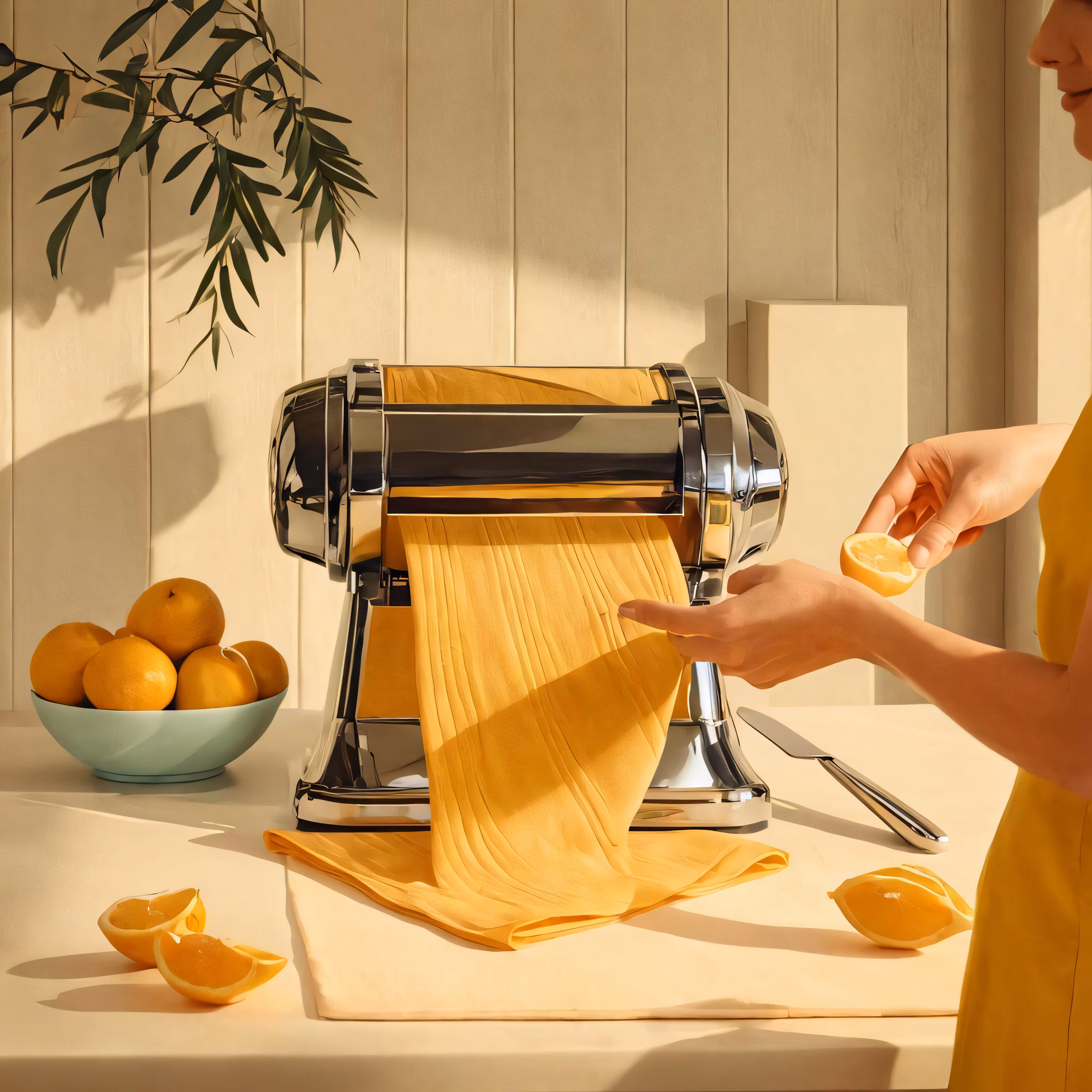 High resolution picture, free to use, a woman slices oranges near an orange machine