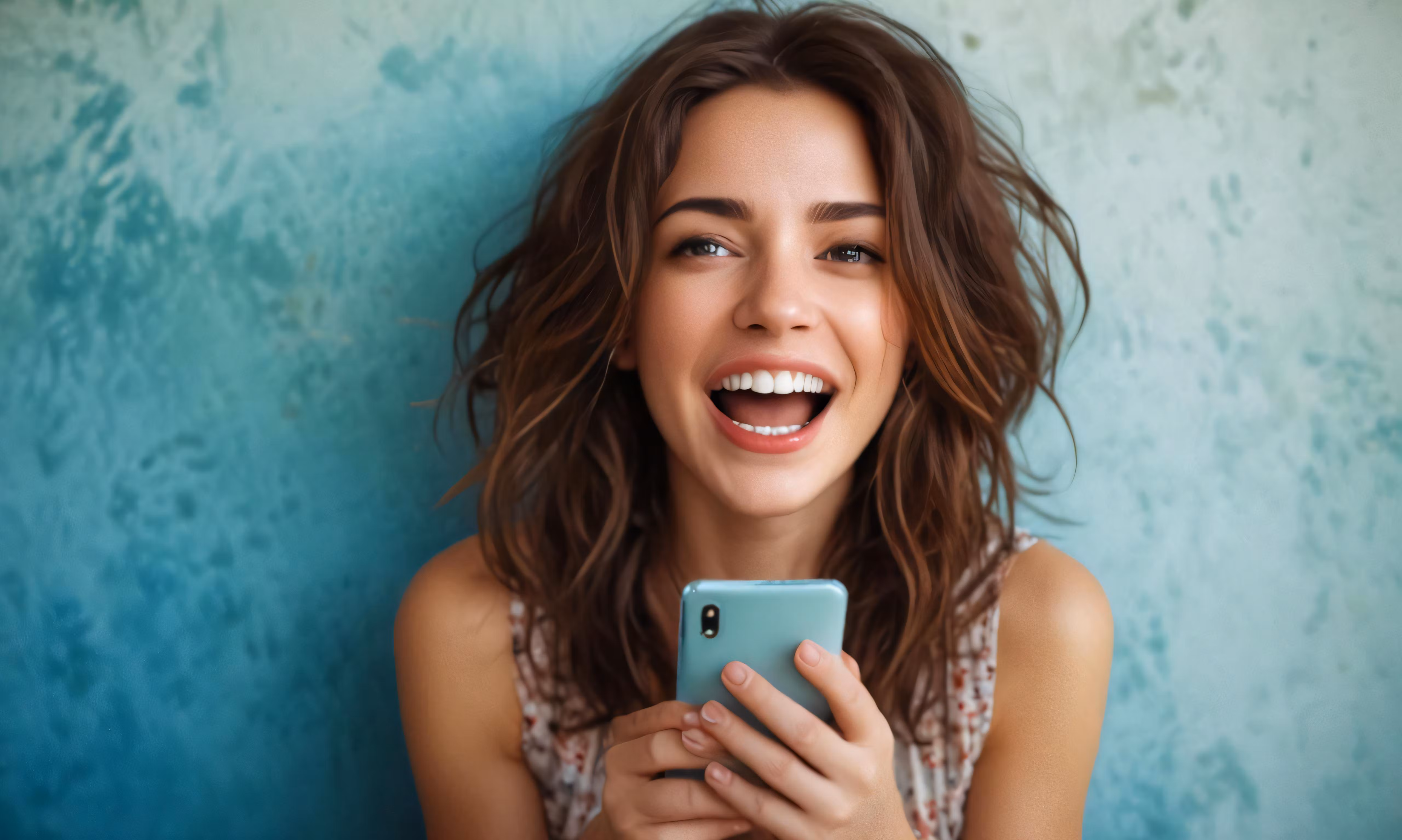 High resolution picture, free to use, a woman smiles while looking at her cell phone