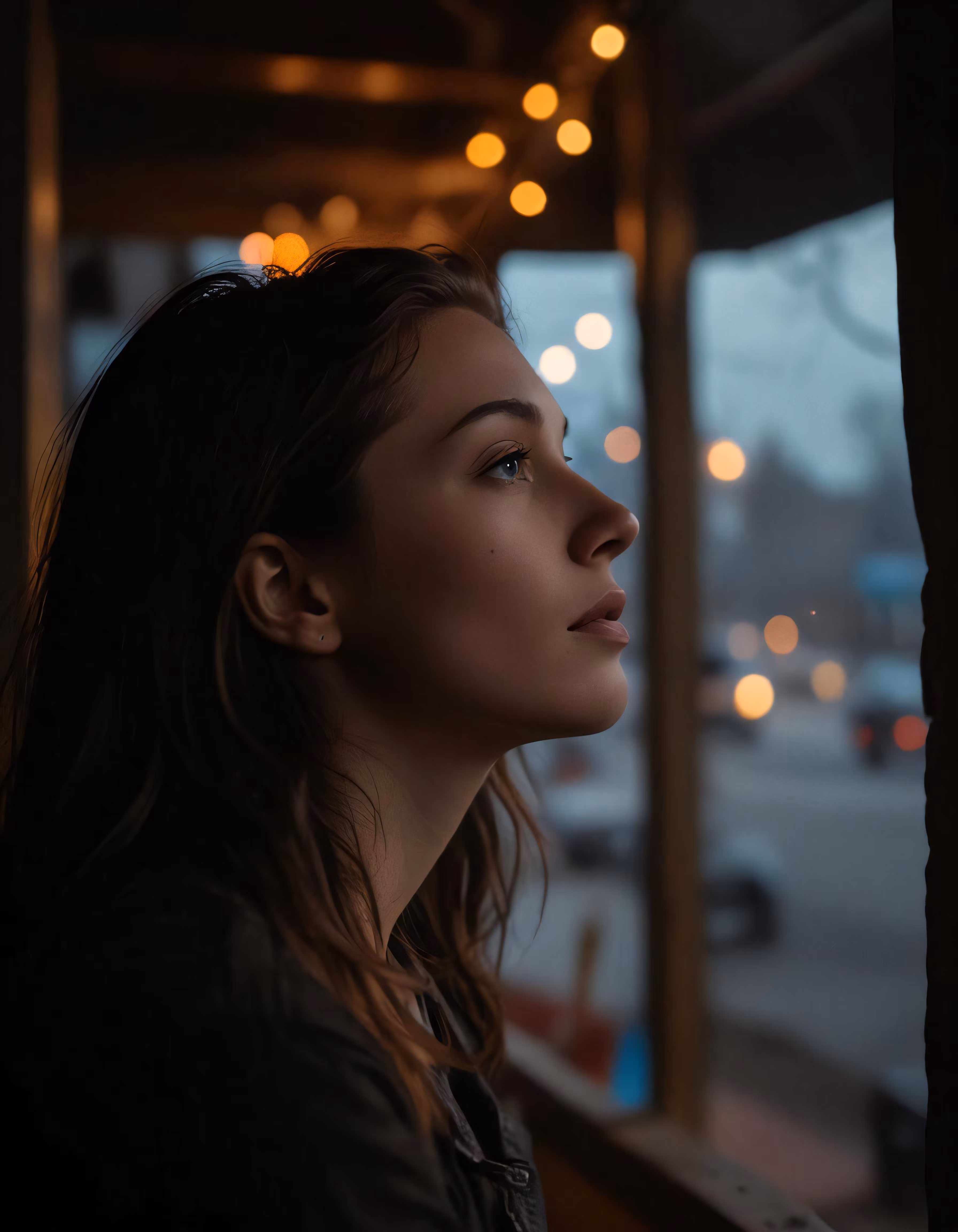 High resolution picture, free to use, a woman standing by a window looking out at the street