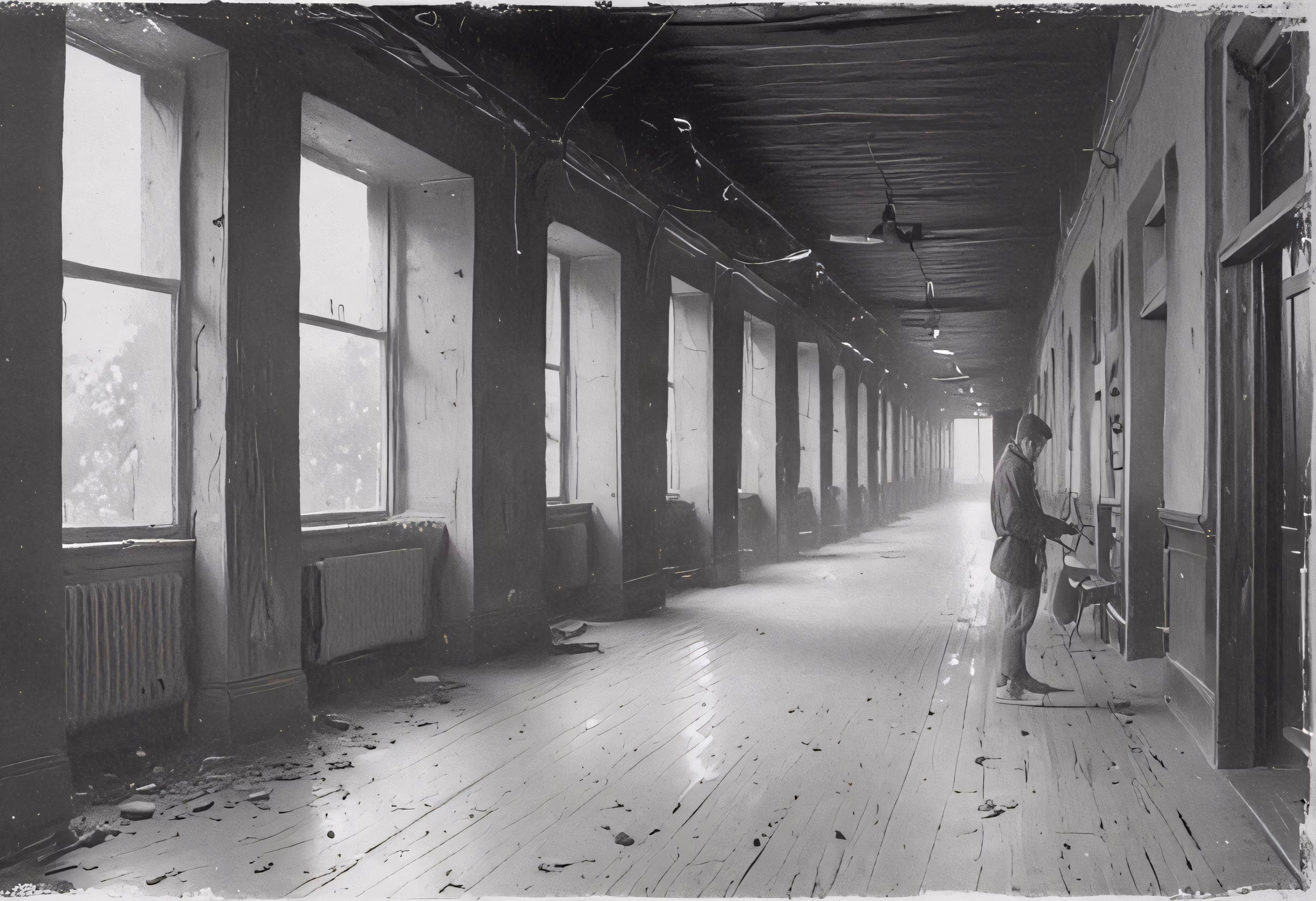High resolution picture, free to use, a woman standing in an empty room with broken windows