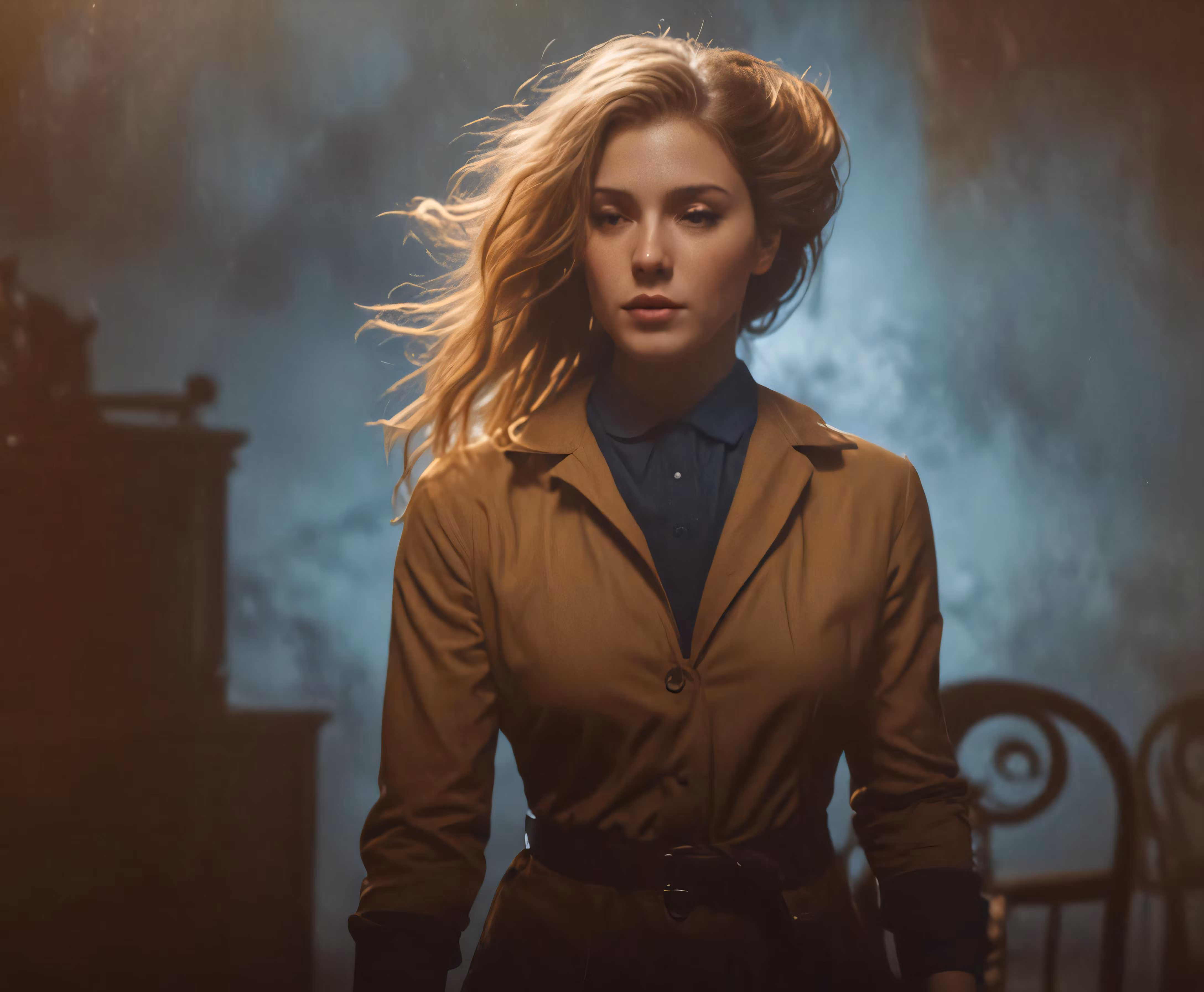 High resolution picture, free to use, a woman standing in front of a building wearing a trench coat