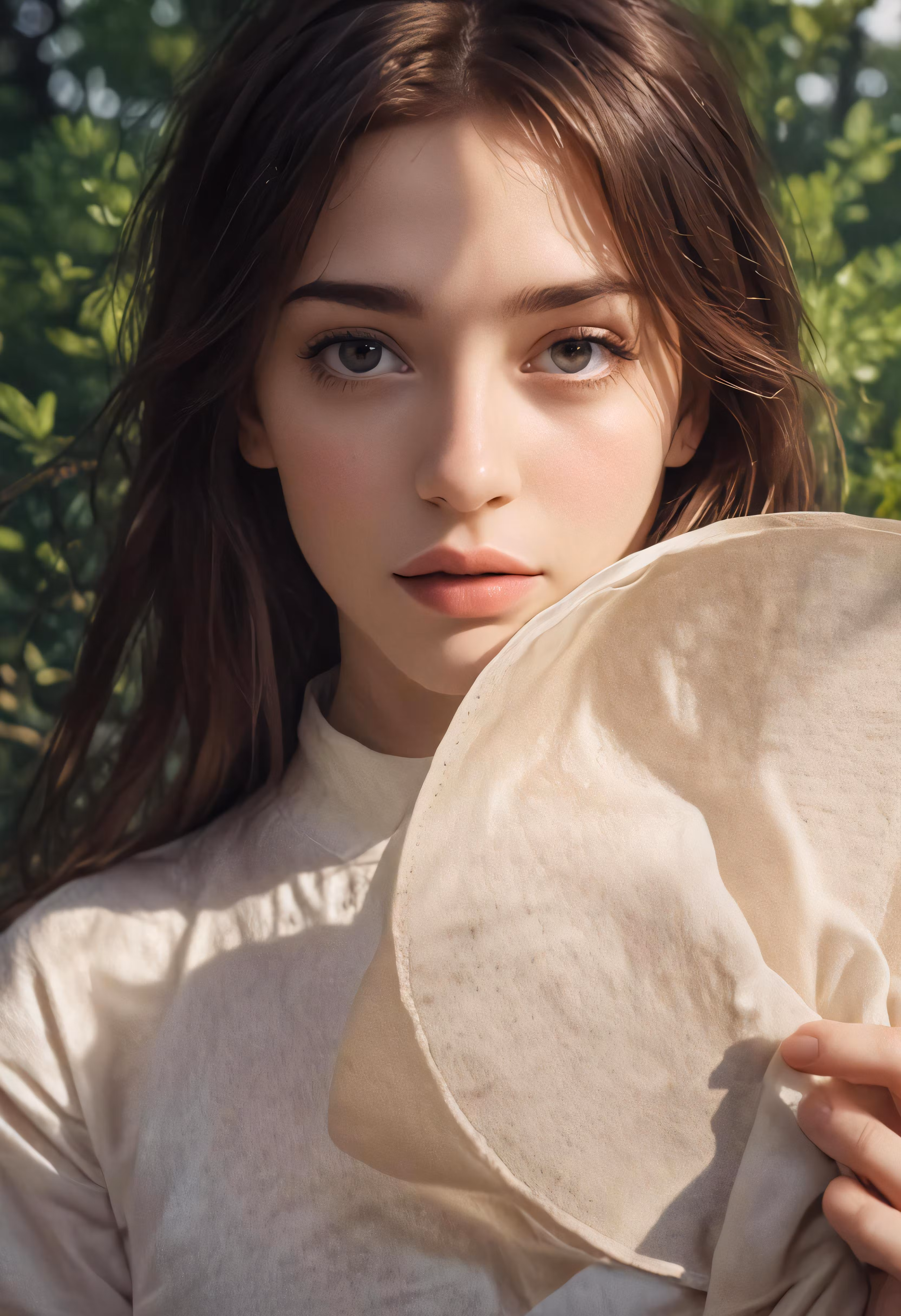 High resolution picture, free to use, a woman standing in front of a green bush holding a white frilly