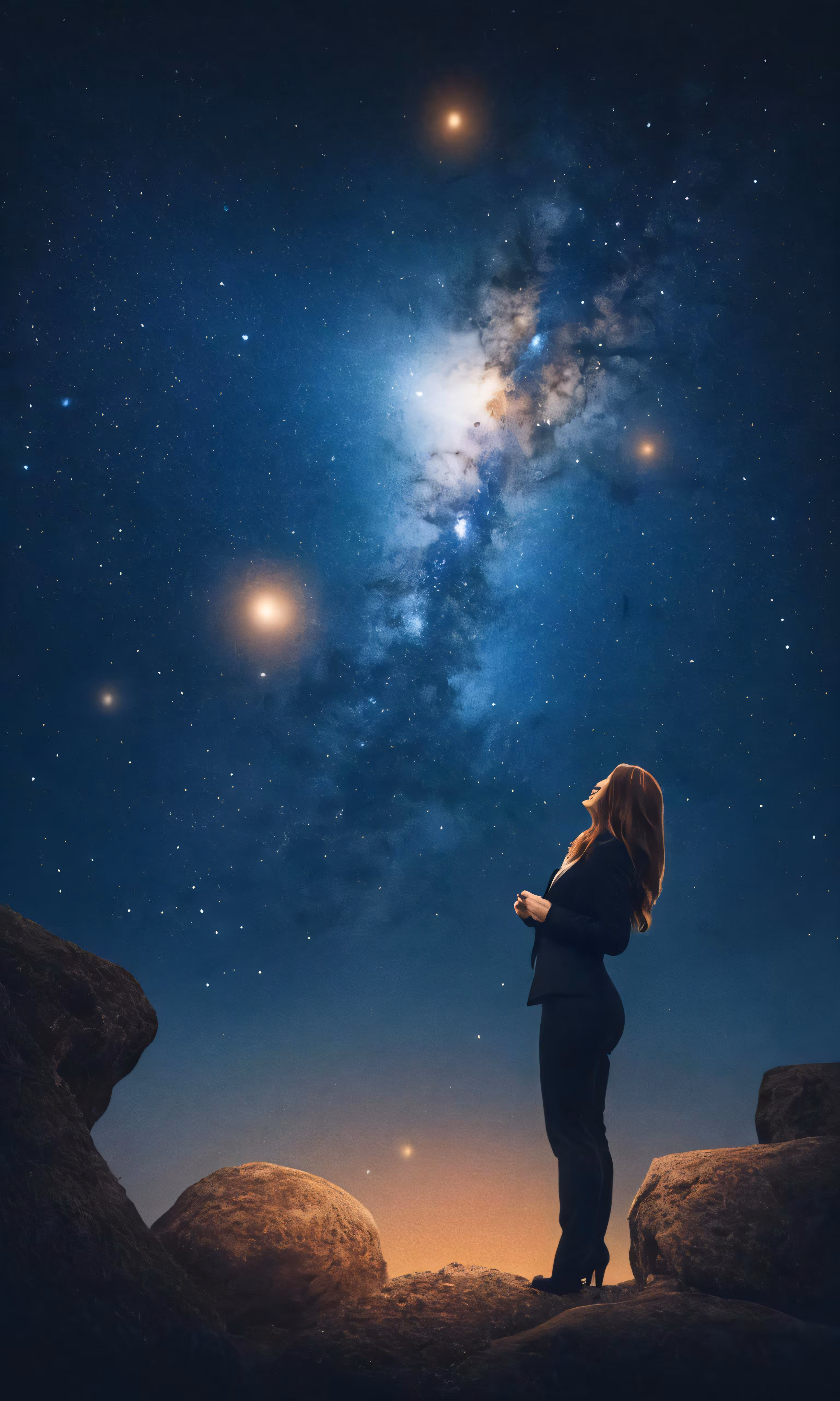 High resolution picture, free to use, a woman standing in front of stars gazing up the sky