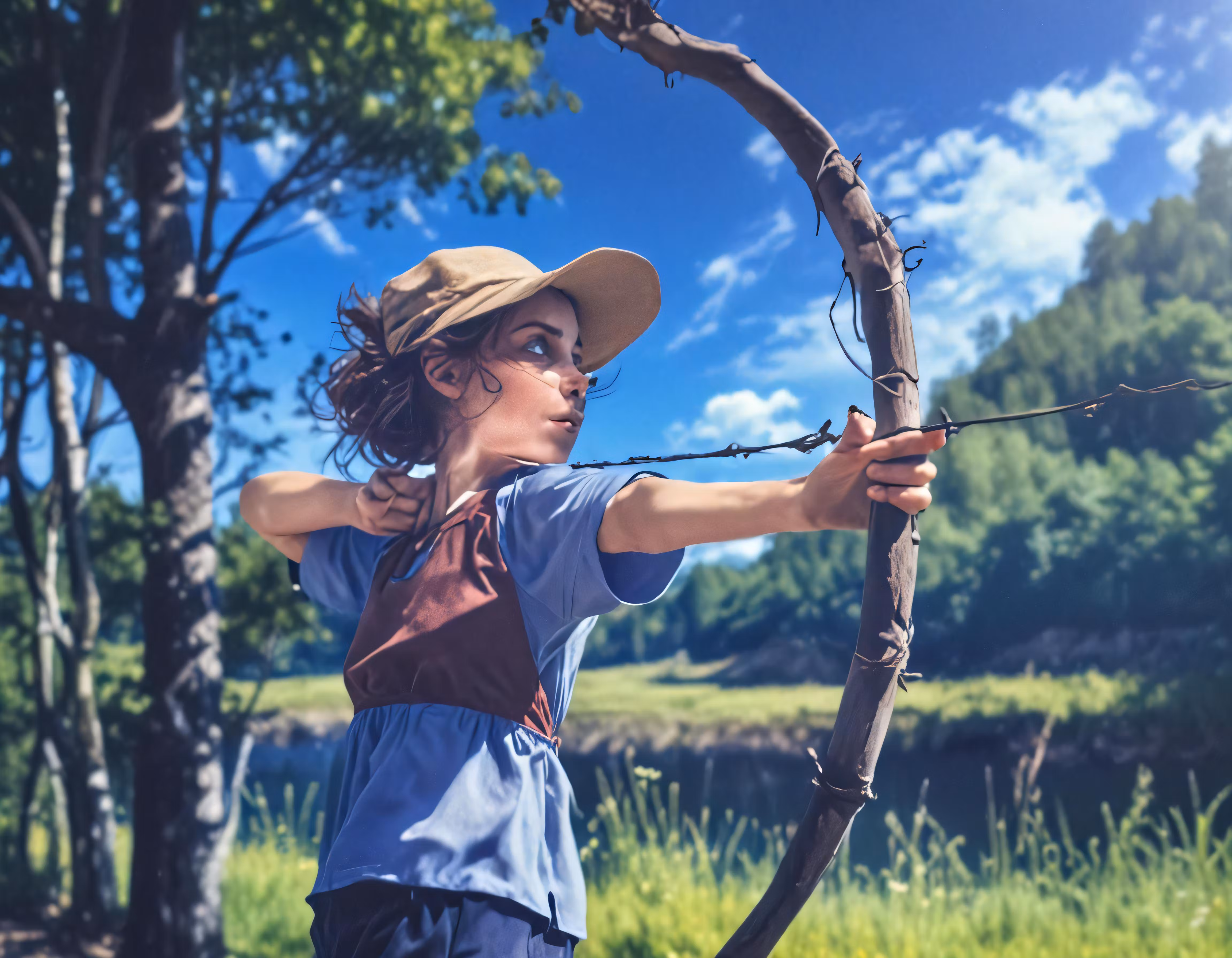 High resolution picture, free to use, a woman standing in the grass holding a bow and arrow