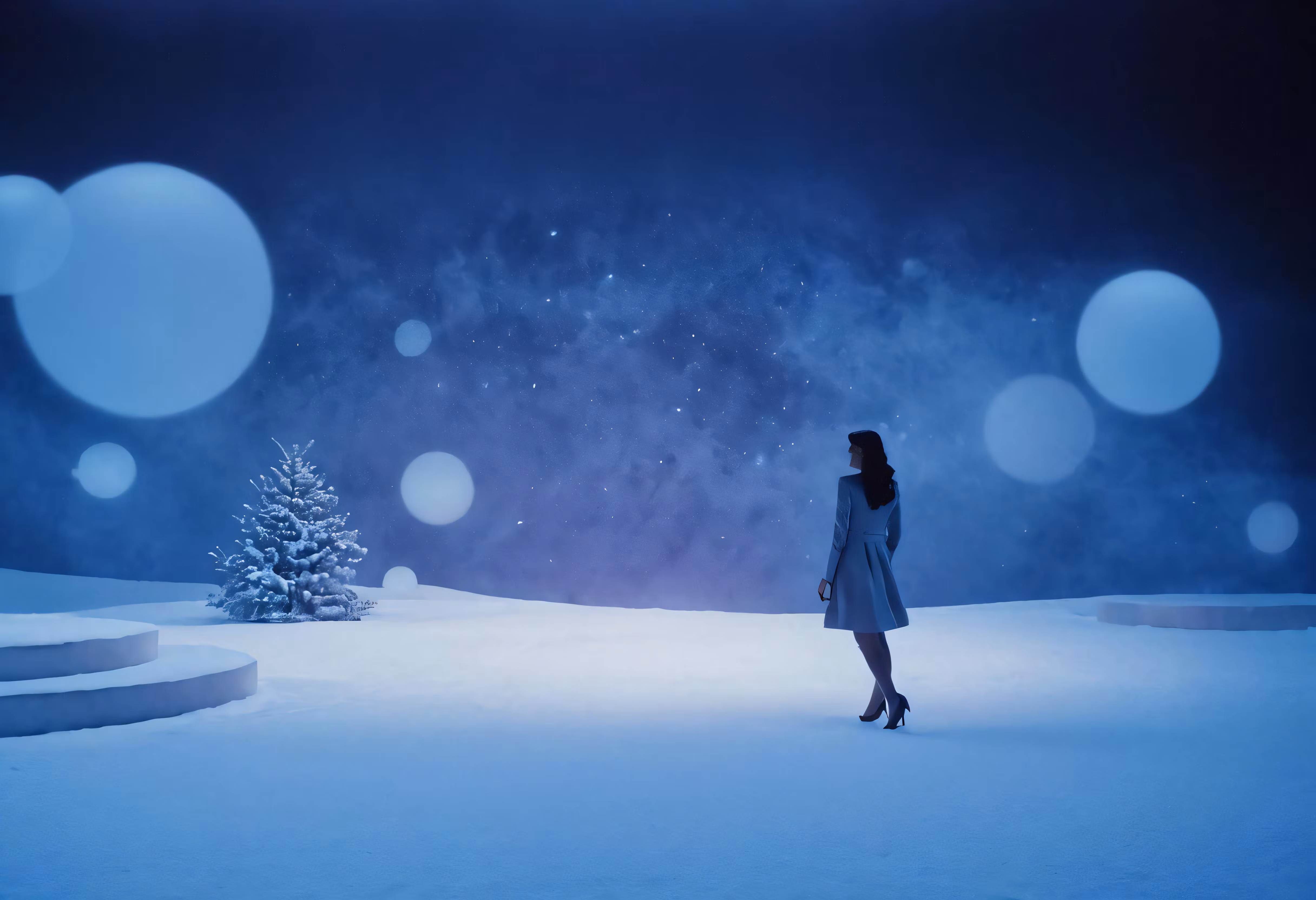 High resolution picture, free to use, a woman standing in the middle of a snowy field