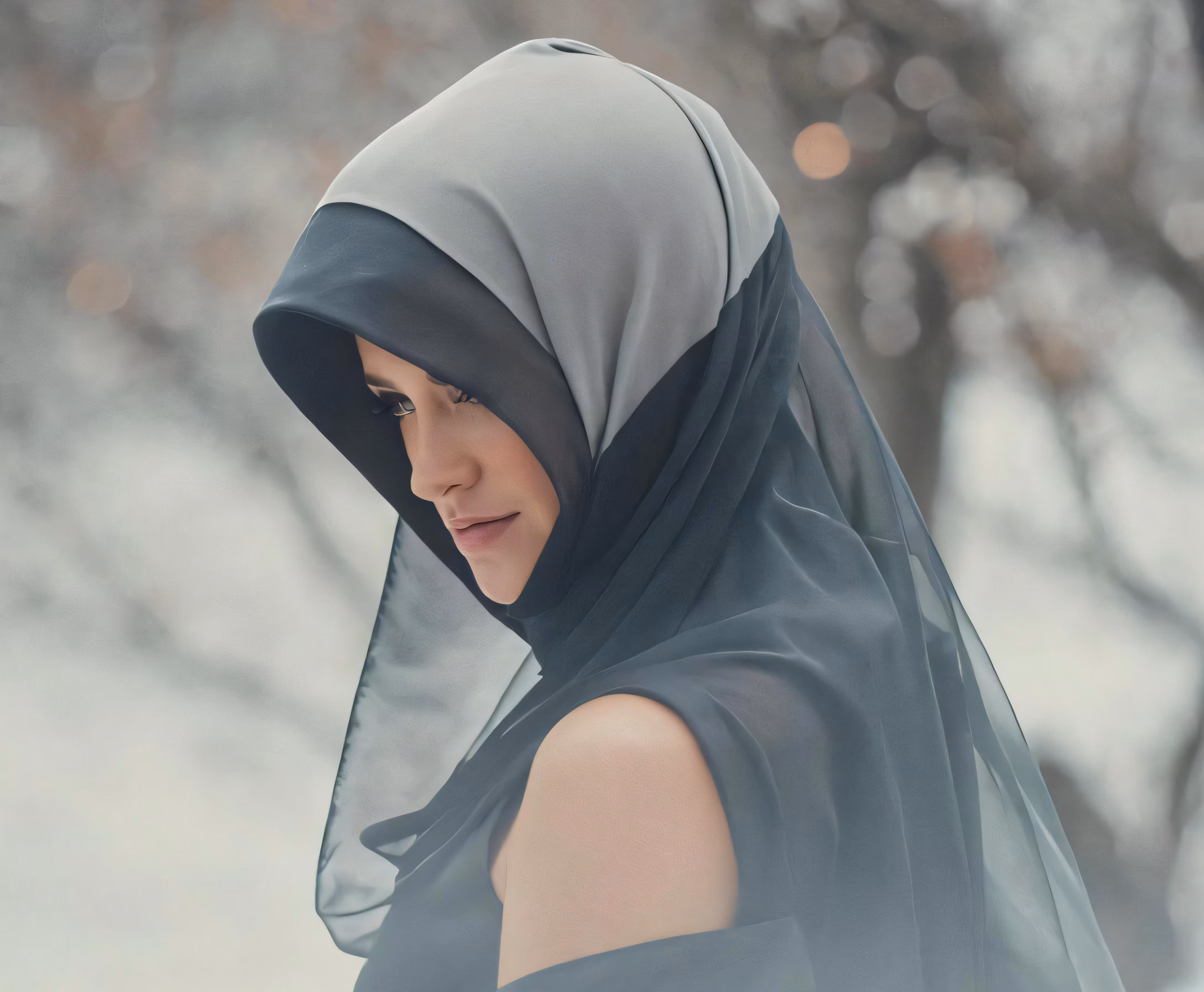 High resolution picture, free to use, a woman standing in the snow with a veil over her head