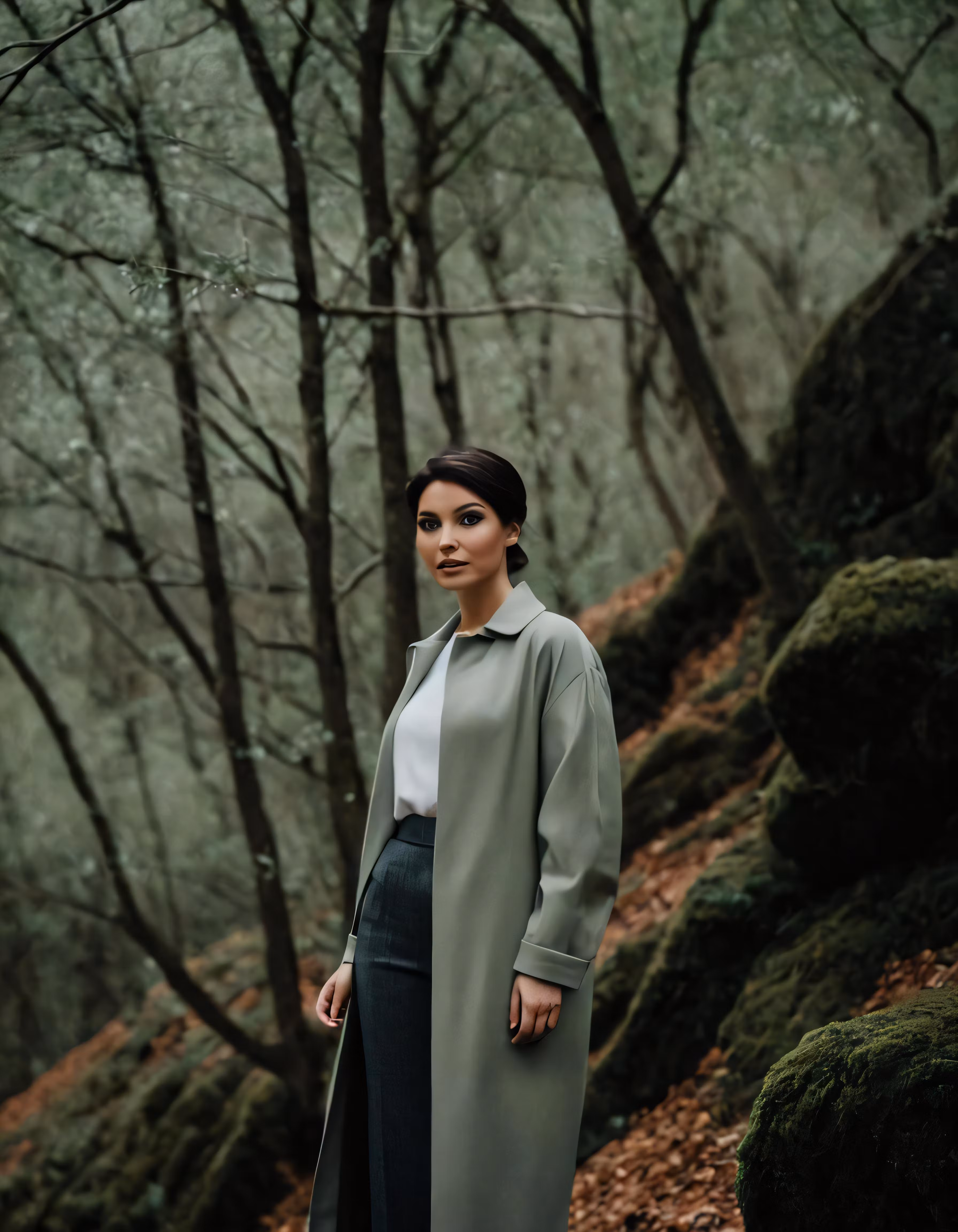 High resolution picture, free to use, a woman standing in the woods next to some trees