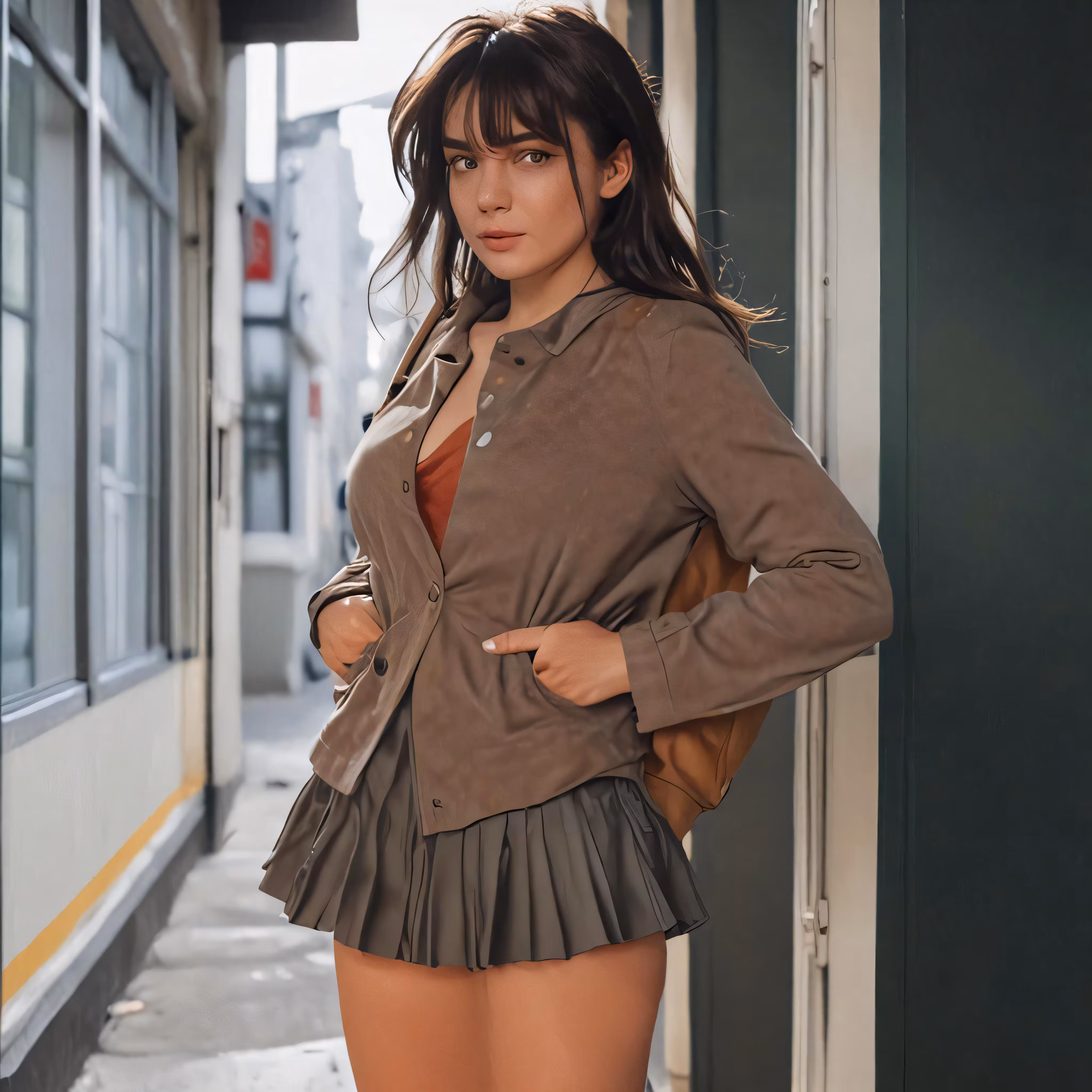 High resolution picture, free to use, a woman standing next to a building with no underwear