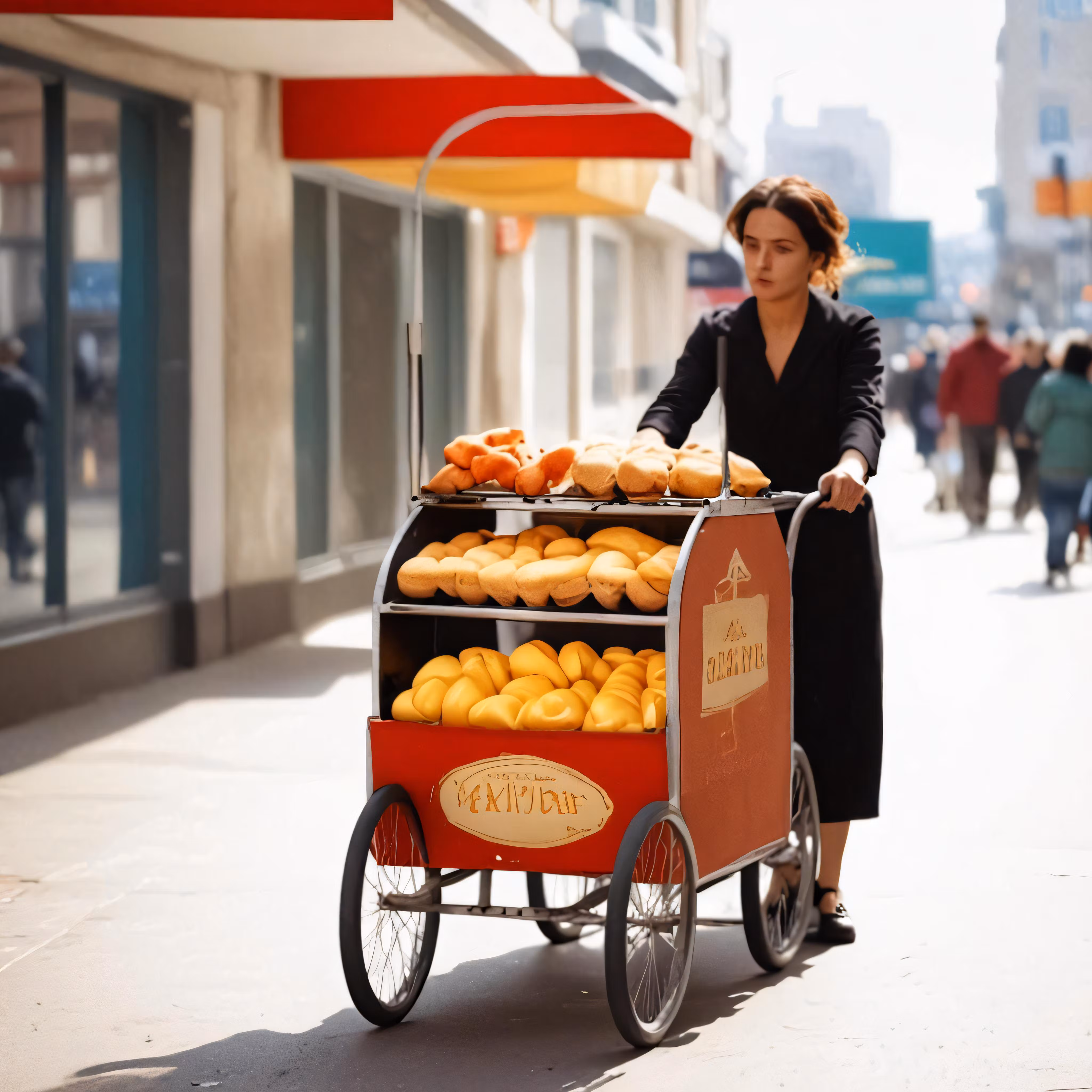 High resolution picture, free to use, a woman standing next to a cart of bread on a street