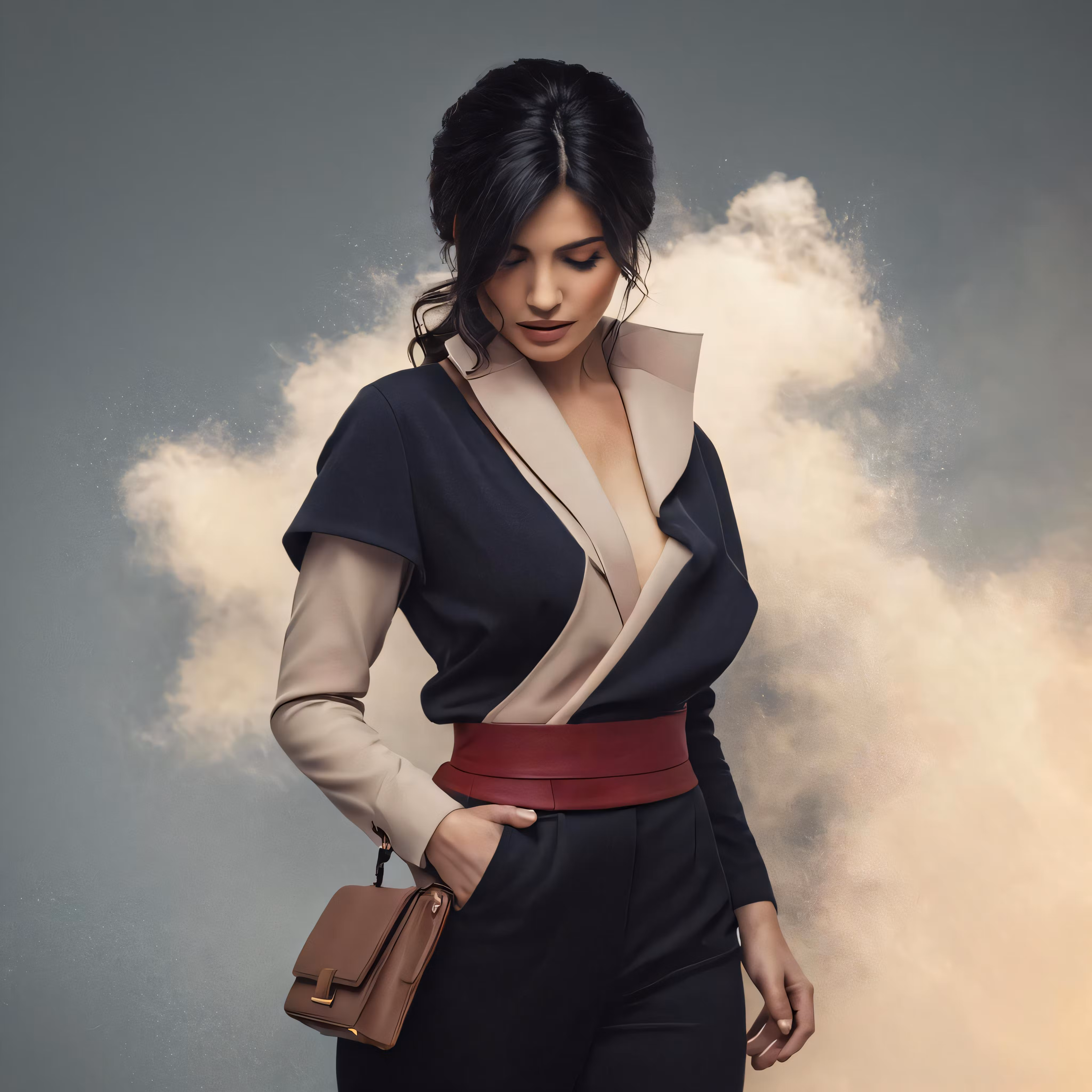 High resolution picture, free to use, a woman standing next to some clouds holding her purse
